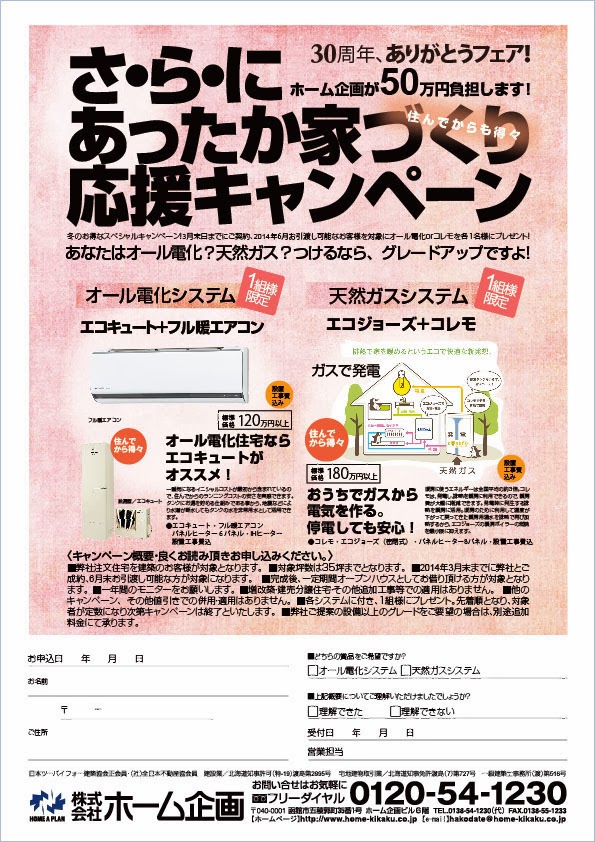 ■弊社注文住宅を建築のお客様が対象となります。 ■対象坪数は35坪までとなります。 ■2014年3月末までに弊社とご成約、6月末お引渡し可能な方が対象になります。 ■完成後、一定期間オープンハウスとしてお借り頂ける方が対象となります。 ■一年間のモニターをお願いします。 ■増改築・建売分譲住宅・その他追加工事等での適用はありません。 ■他のキャンペーン、 その他値引きでの併用・適用はありません。 ■各システムに付き、1組様にプレゼント。先着順となり、対象者が定数になり次第キャンペーンは終了といたします。 ■弊社ご提案の設備以上のグレードをご要望の場合は、別途追加料金にて承ります。