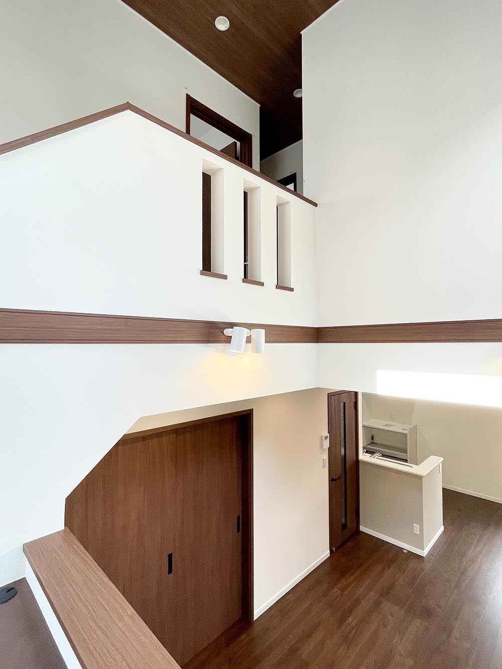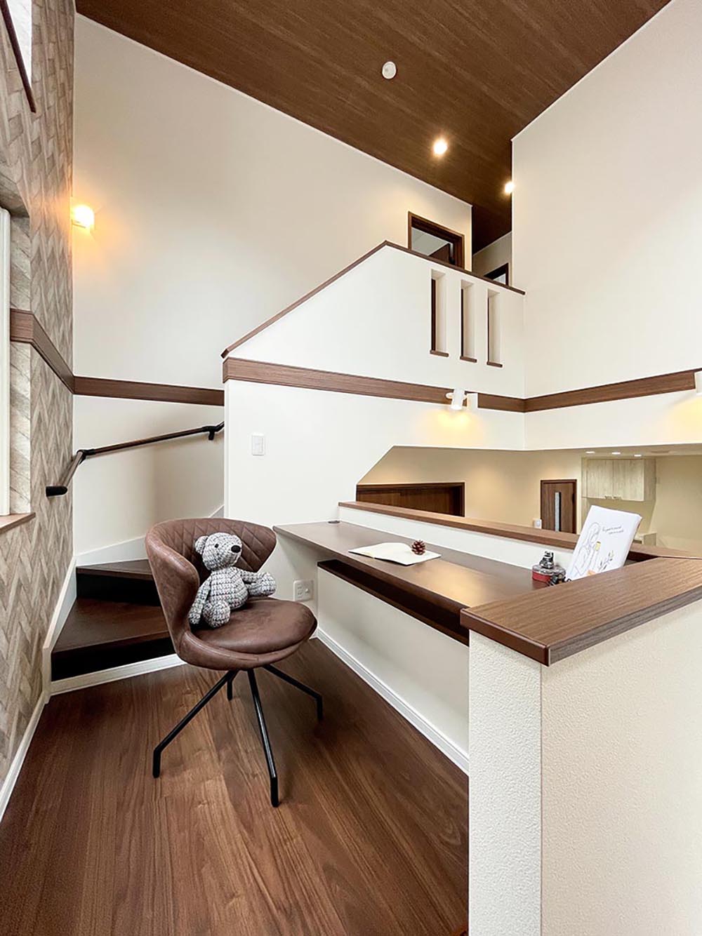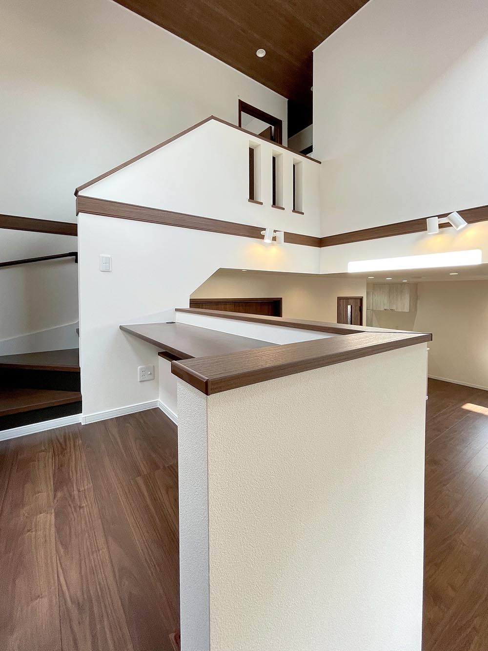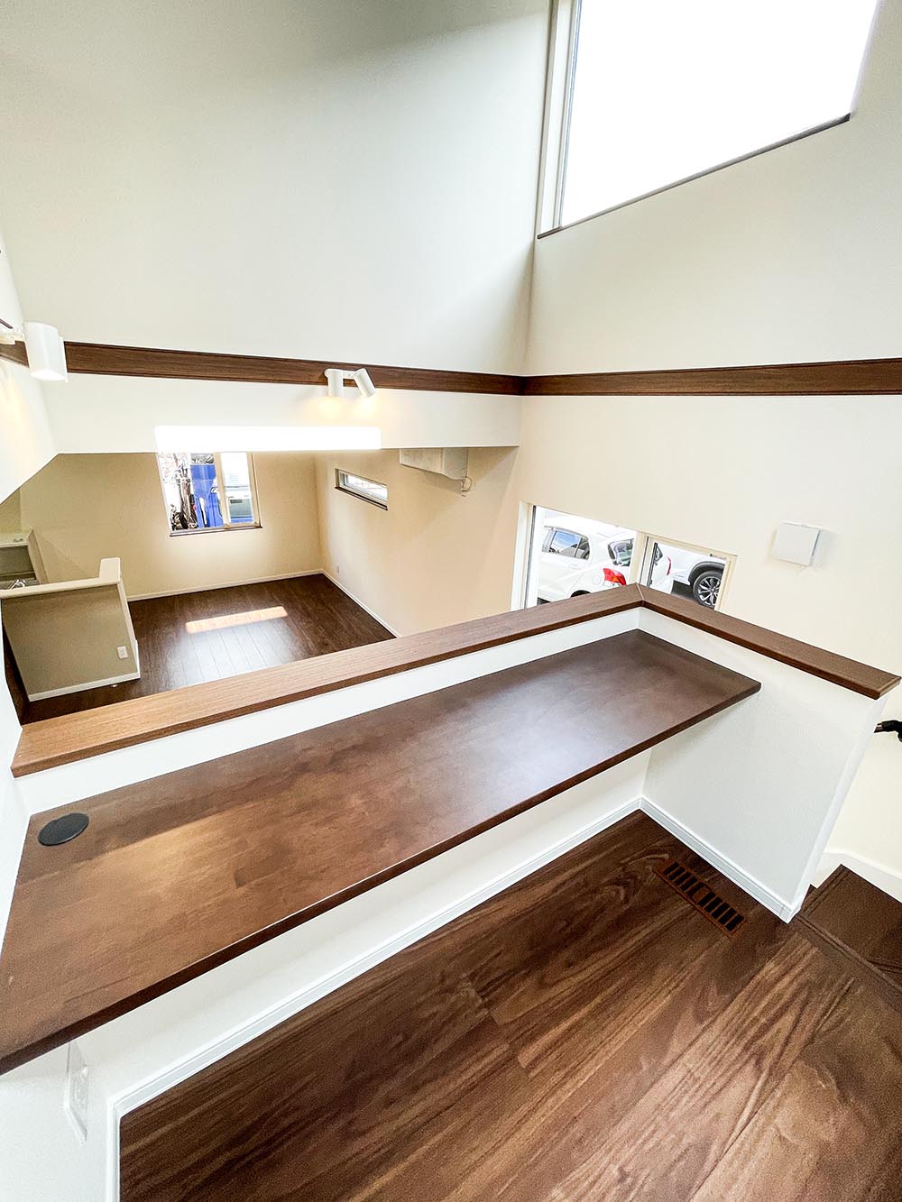 建物は、「家の中も眺めがいい、大収納の中2階、ラピュタ1.・1/2」。2階ホール、中2階からの眺めがいいんです。中2階は1階と2階の間のスペース。そのスペースにテーブルカウンターを設置し、様々な使い方で空間を楽しんでいただだけます。例えば、キッチンの向かい側にあるのでこの中2階スペースを子供たちの勉強スペースにすると、キッチンからお父さん、お母さんが子供たちの雰囲気を見ながら安心してお仕事。「進み具合はどうかな?そろそろ休憩にする?」と声もかけやすいんです。また大人の趣味のスペースとして、本棚を持ってきて読書スペースとして、またカフェスペースとして等家族の発想力で様々な使い方ができちゃいます。中2階下も収納だけじゃない可能性大の魅惑のスペース。収納としての利用はもちろん、猫ちゃんわんちゃんのくつろぎスペースとして。またここでも気軽に読書をするヌックスペースとして、子供たちの秘密の基地としてなどなど、ワクワクが沢山のスペースです。写真だけでは伝わりづらい空間、是非一度ご見学を!