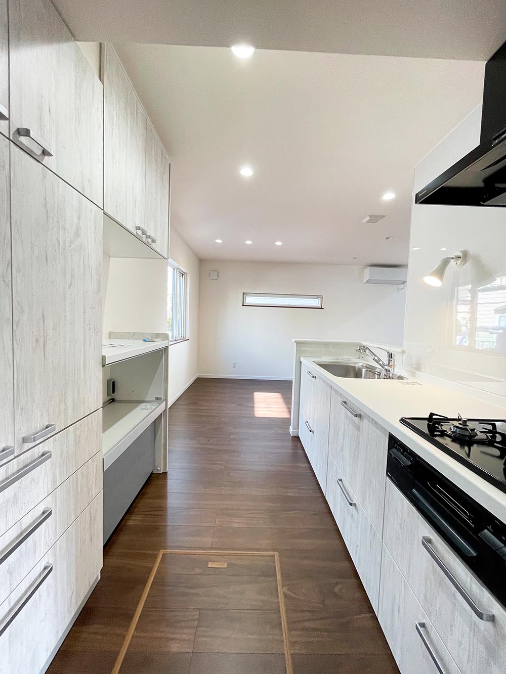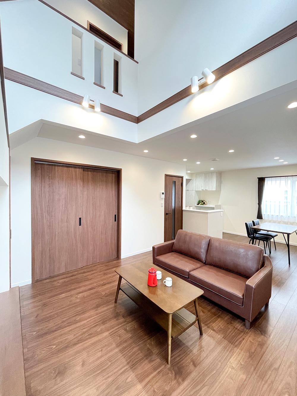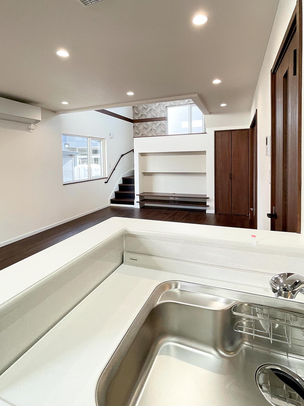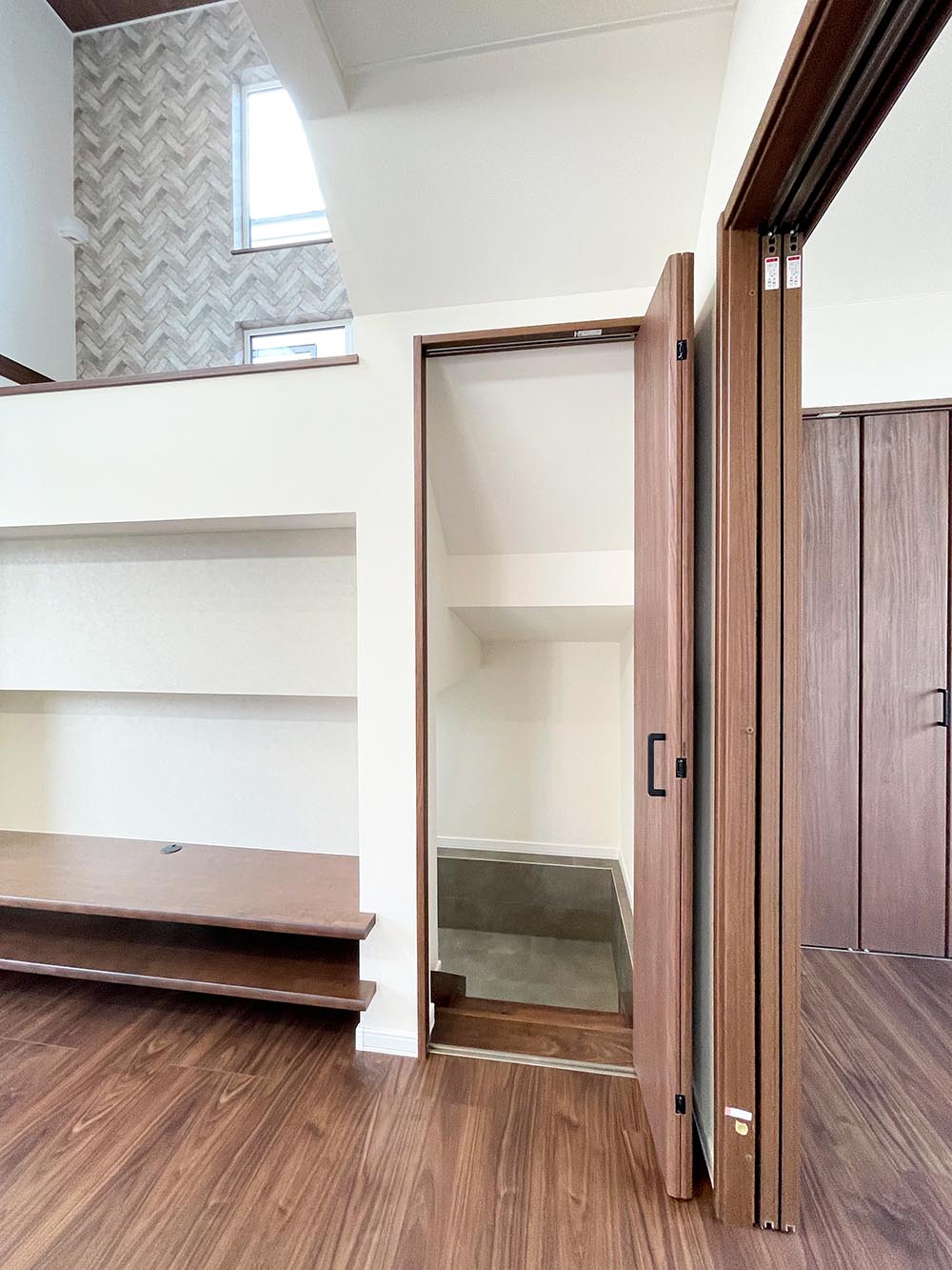 建物は、「家の中も眺めがいい、大収納の中2階、ラピュタ1.・1/2」。2階ホール、中2階からの眺めがいいんです。中2階は1階と2階の間のスペース。そのスペースにテーブルカウンターを設置し、様々な使い方で空間を楽しんでいただだけます。例えば、キッチンの向かい側にあるのでこの中2階スペースを子供たちの勉強スペースにすると、キッチンからお父さん、お母さんが子供たちの雰囲気を見ながら安心してお仕事。「進み具合はどうかな?そろそろ休憩にする?」と声もかけやすいんです。また大人の趣味のスペースとして、本棚を持ってきて読書スペースとして、またカフェスペースとして等家族の発想力で様々な使い方ができちゃいます。中2階下も収納だけじゃない可能性大の魅惑のスペース。収納としての利用はもちろん、猫ちゃんわんちゃんのくつろぎスペースとして。またここでも気軽に読書をするヌックスペースとして、子供たちの秘密の基地としてなどなど、ワクワクが沢山のスペースです。写真だけでは伝わりづらい空間、是非一度ご見学を!