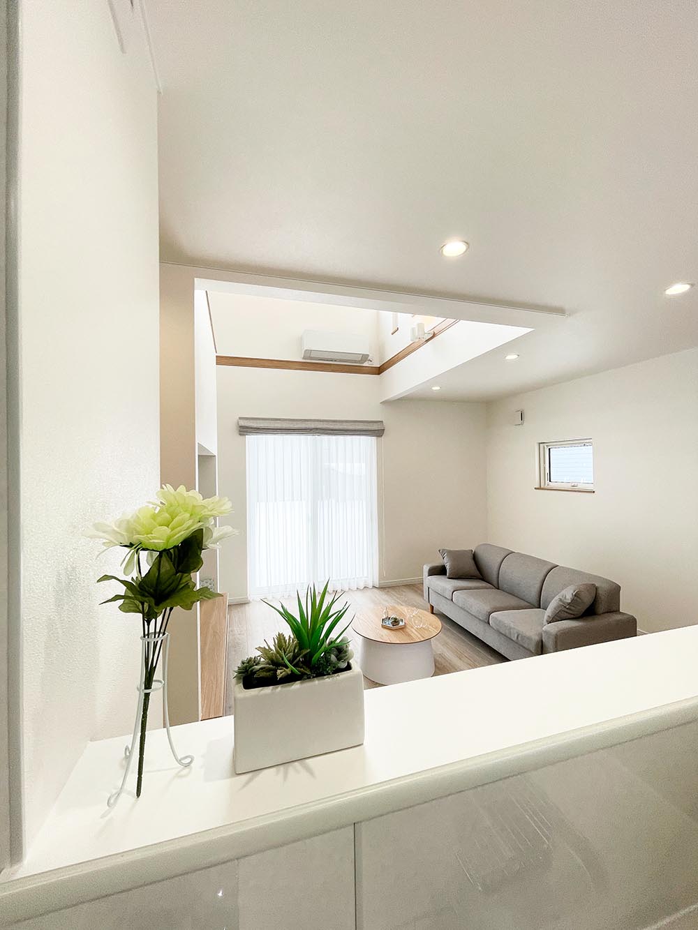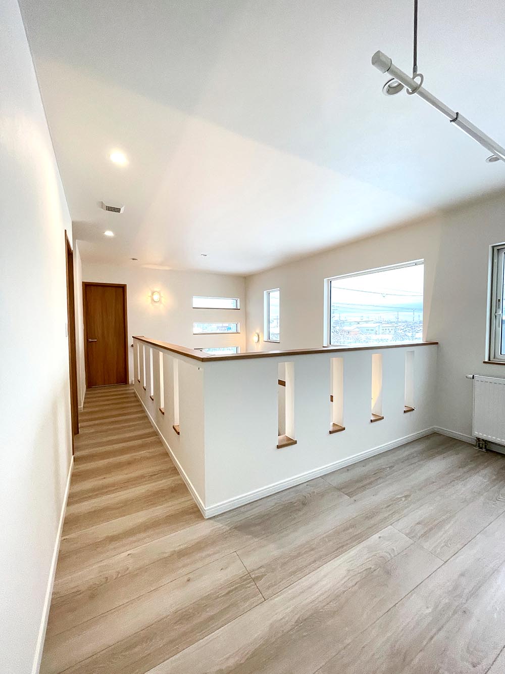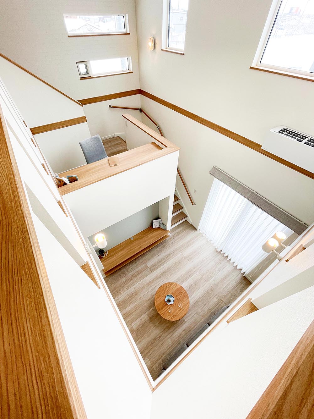 上も下も使いたい放題!なんです。今回の中2階は玄関ホールから2段ほどの階段を降りていきます。2階にはフリーホールがあります。このスペースも自由にご利用いただきます。こちらからもきっと素敵な景色が見られるはず。くつろぎスペースとしてまたは、お洗濯物を干したり。いろいろと利用可能です。