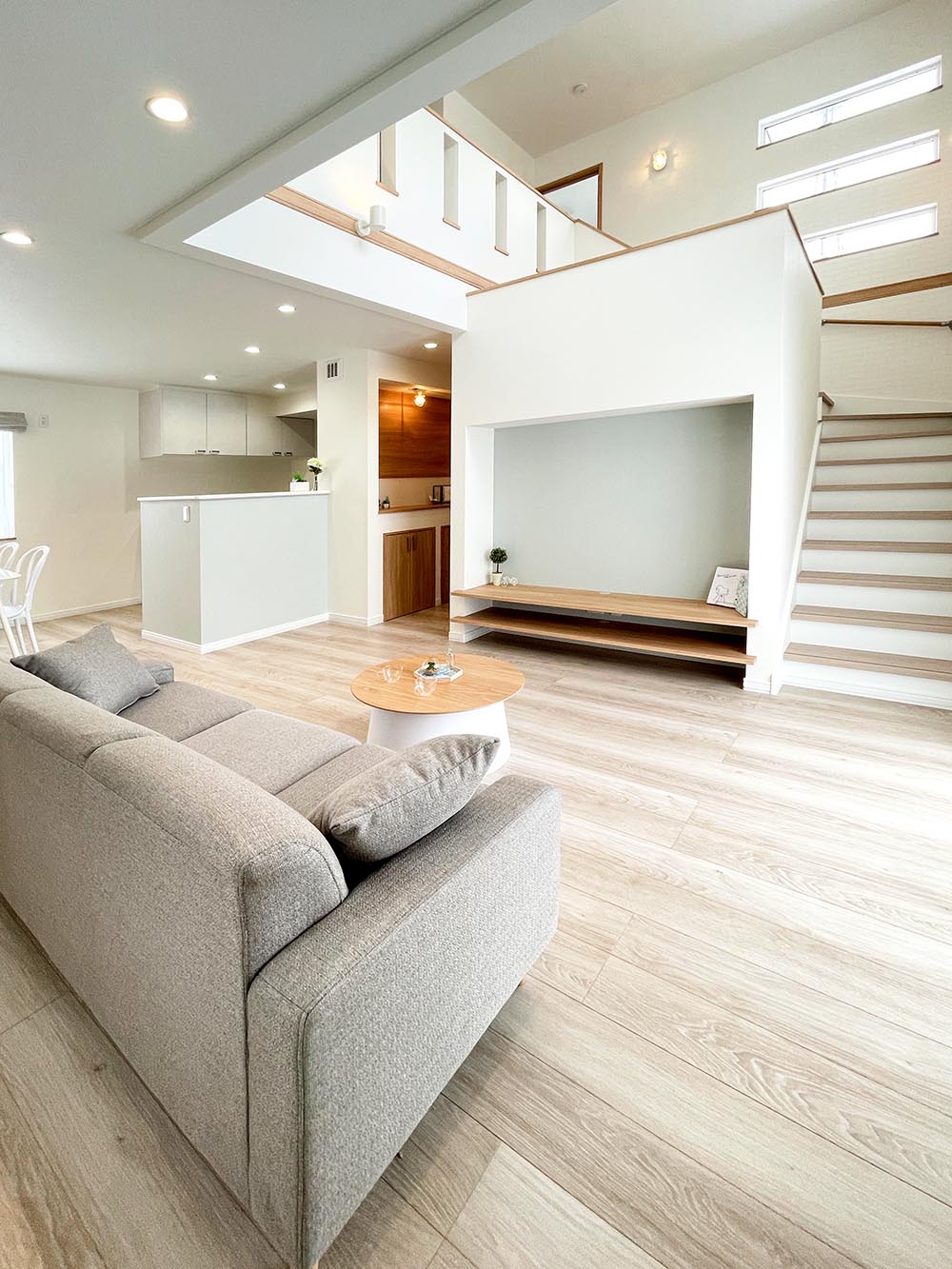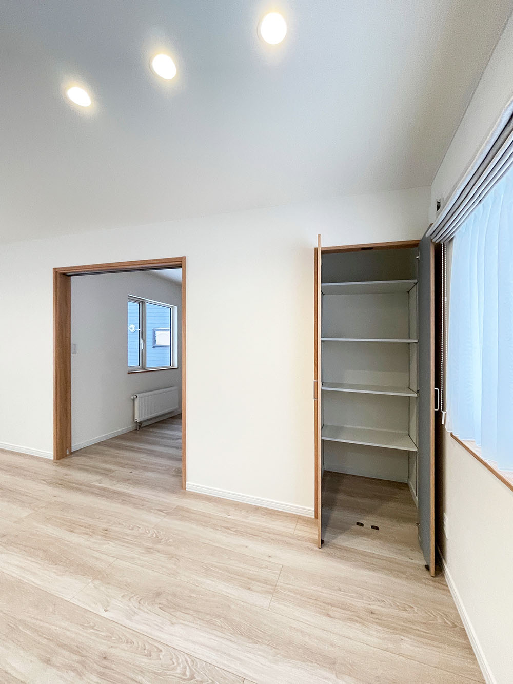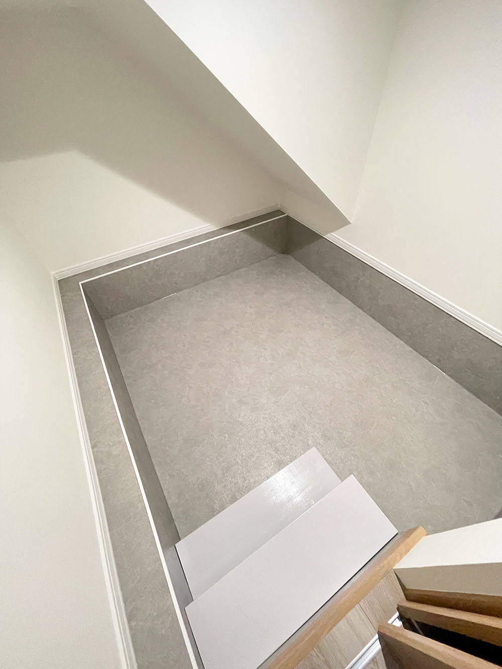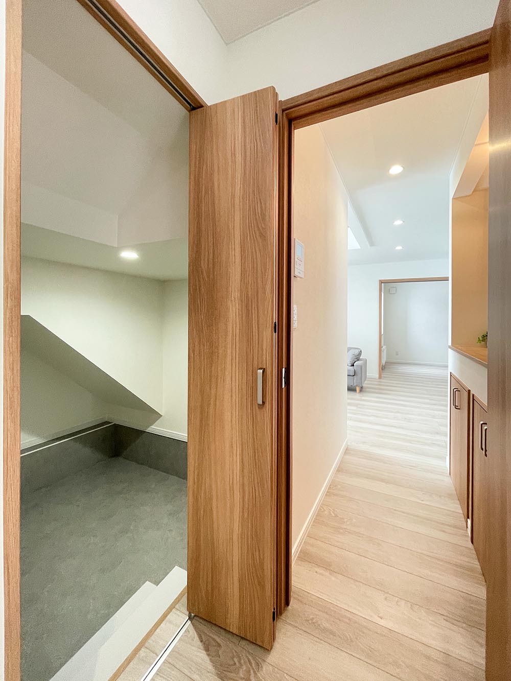 中2階の下は収納になっています。この収納スペースはしっかりと内装も施されますので、収納としてはもちろん、子供たちの秘密基地や、わんちゃんねこちゃんたちの寛ぎスペース、または大人の為のWEB会議スペースとしてなど、家族の想像力で様々に使えるワクワクのスペース。