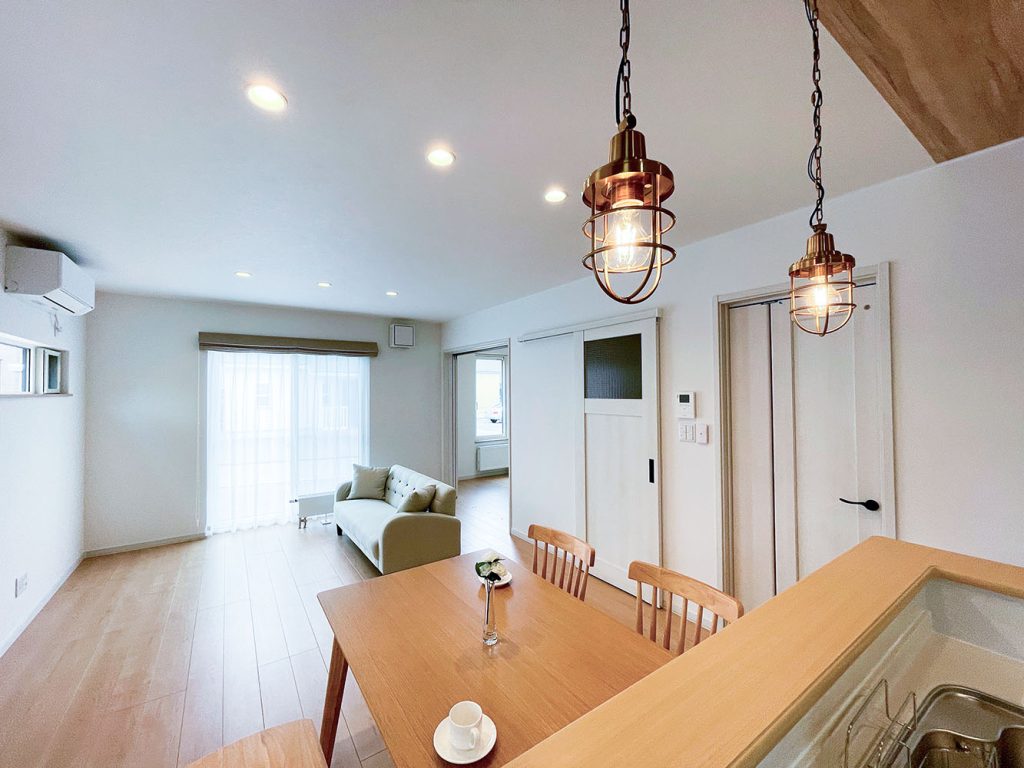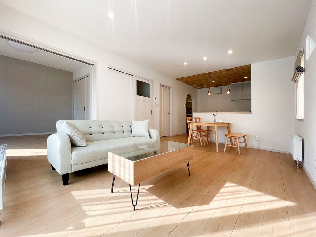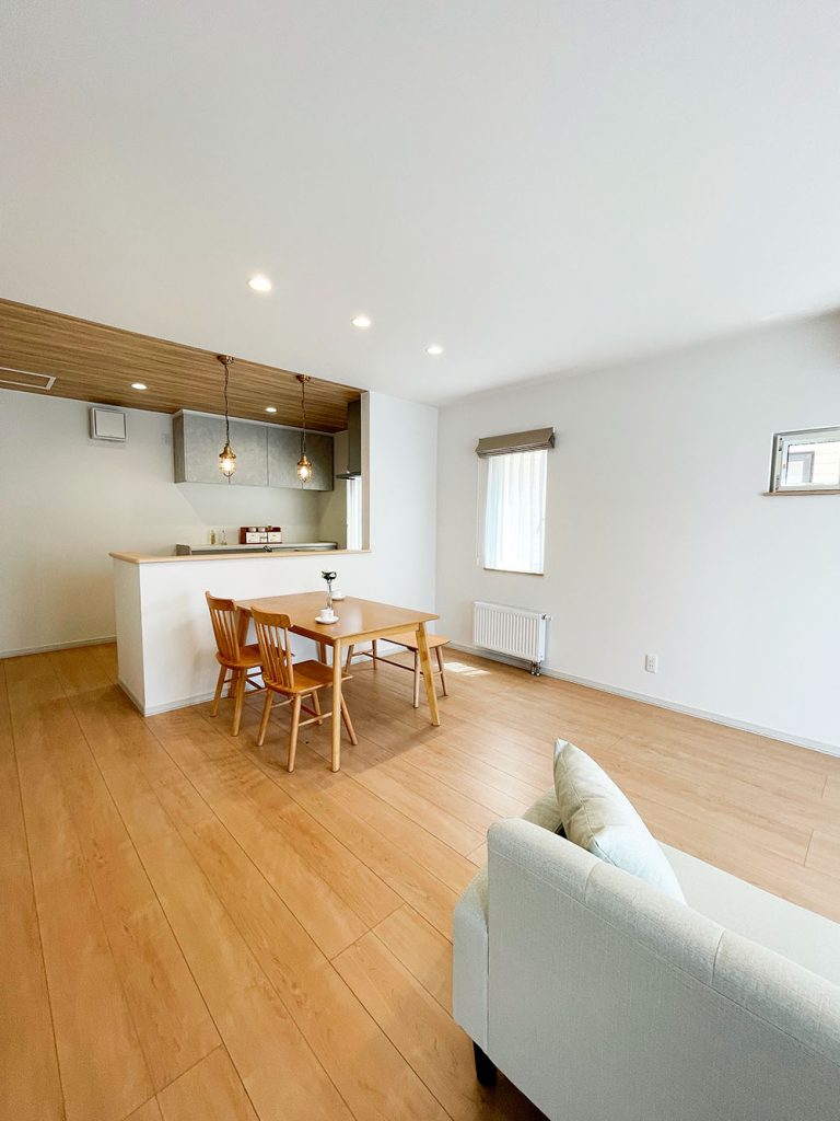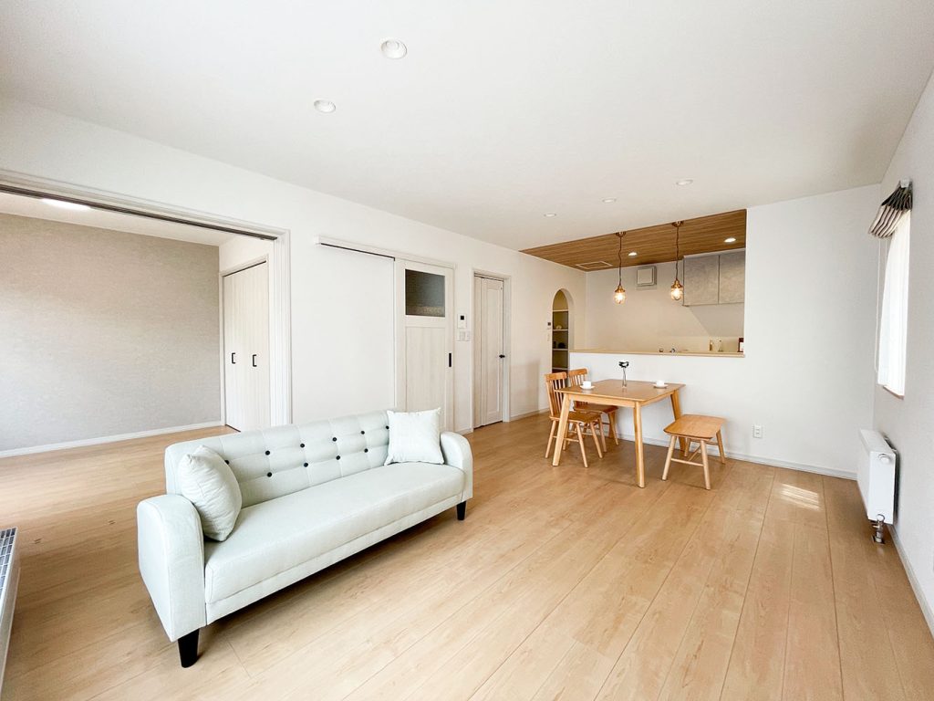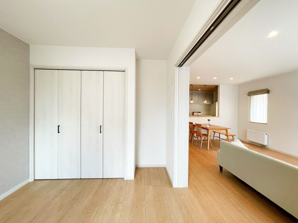 16帖のLDKですが、リビング横の5.25帖の洋室があることで少し空間に広がりを感じる事ができます。引き戸で開口部が広くなるので、その効果を高めてくれます。