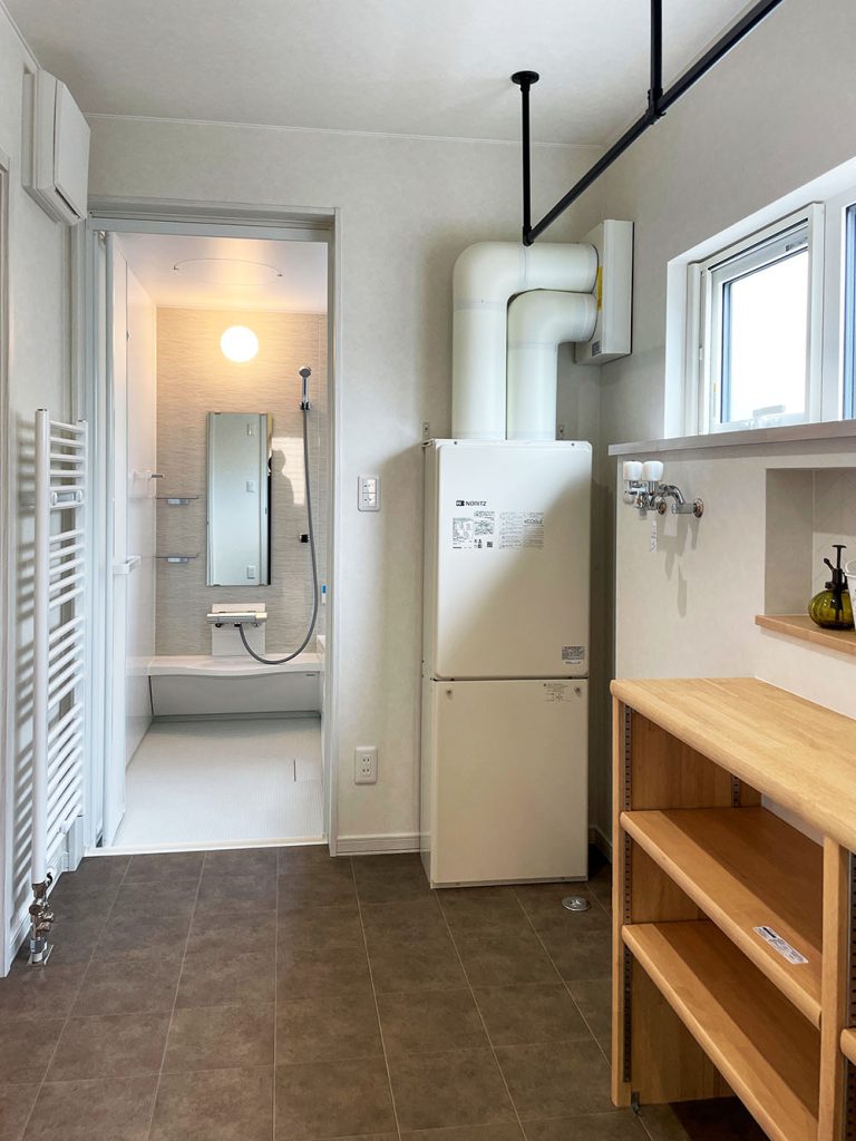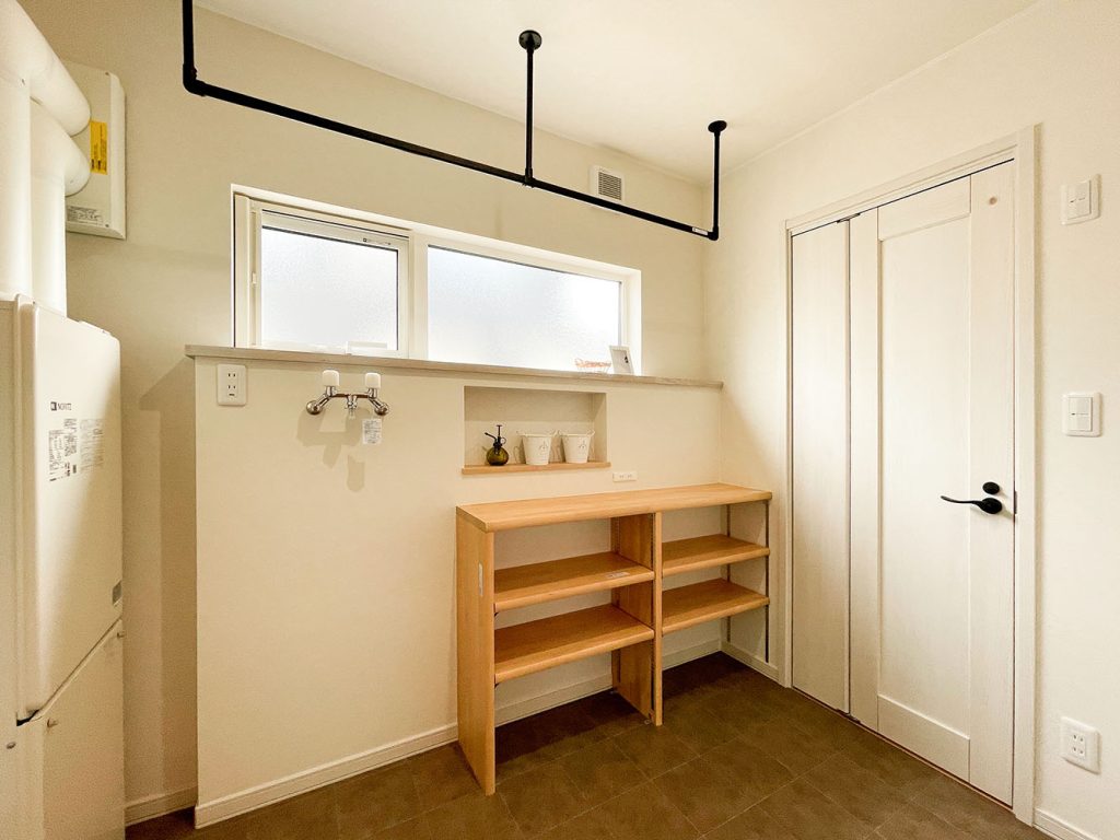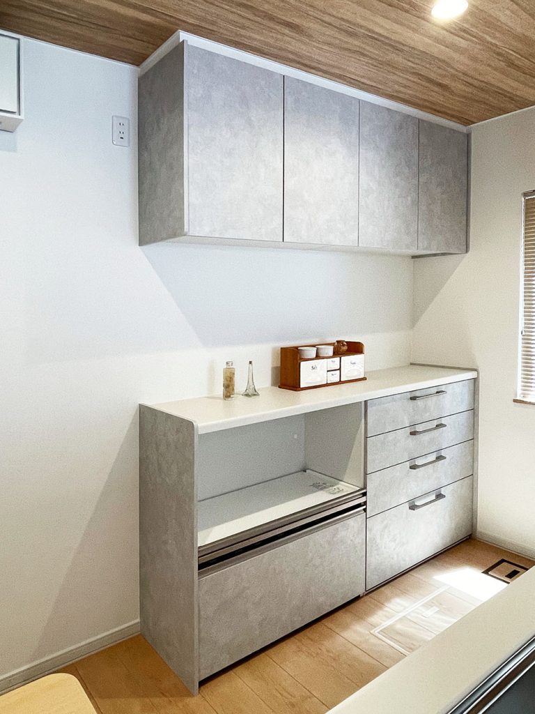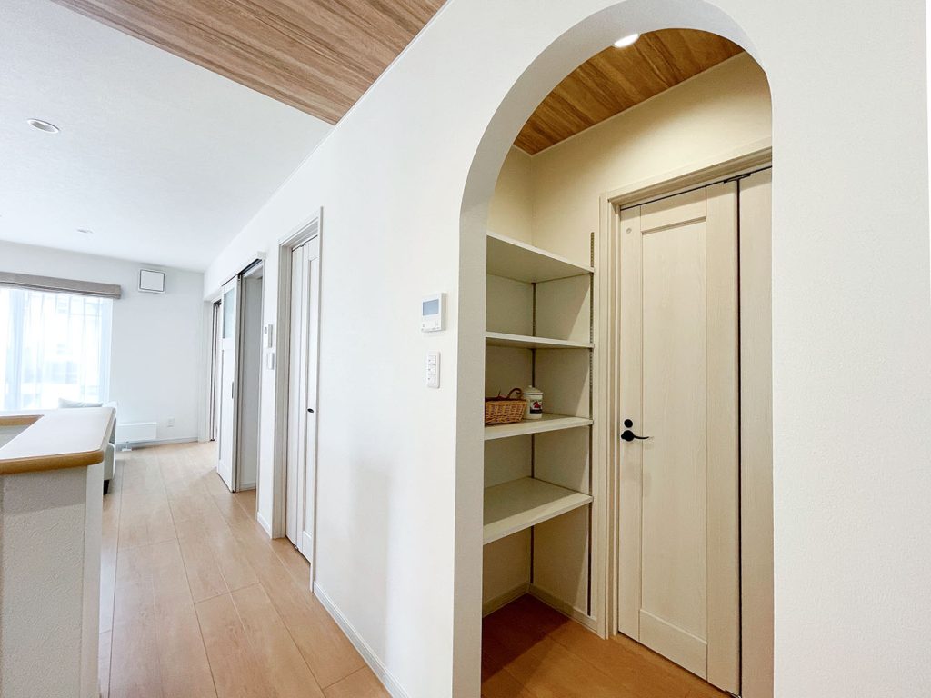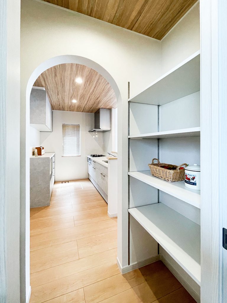 キッチン横のパントリーにもしっかり可動式の棚を設置。目に見える収納は家族に優しい収納。