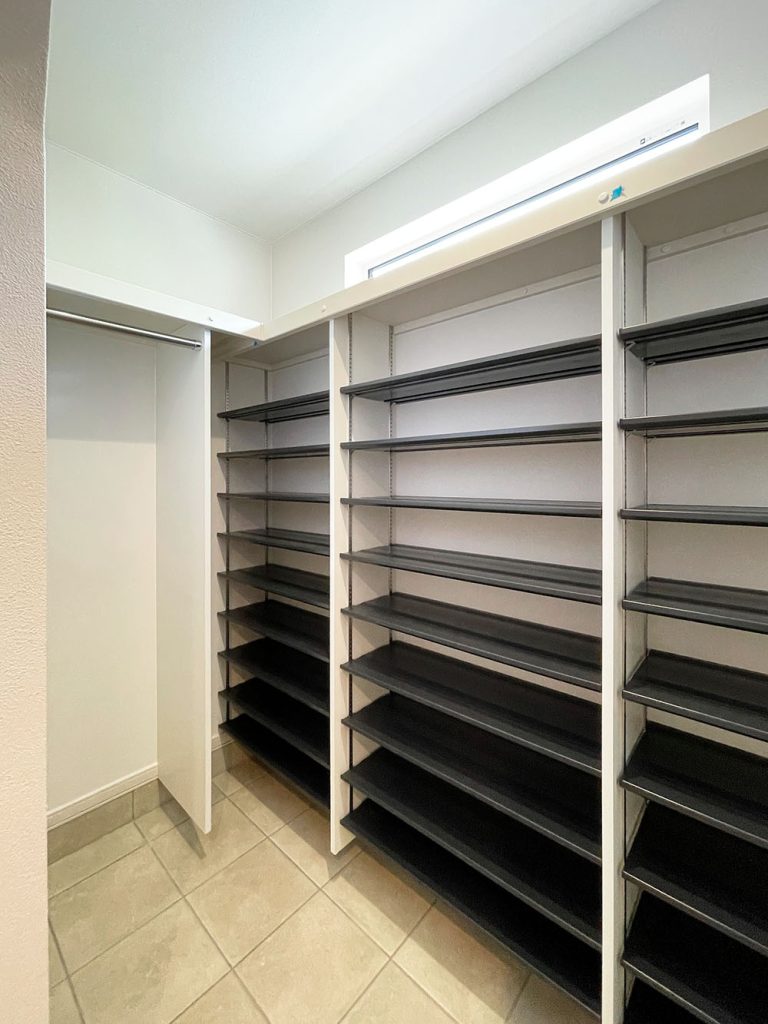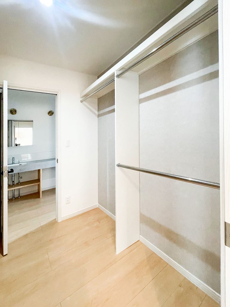 リビングと洗面室から出入りできる2.25帖のウォークインクローゼットも、しっかり可動式の棚を設置。高いところまで十分に使えるのがとっても便利。上手に使ってお家の中すっきり!ファミリークローゼットとしても十分な 広さです!