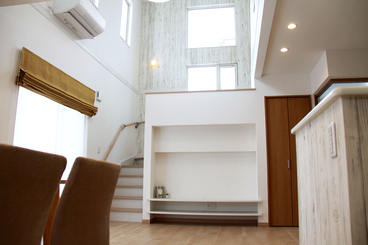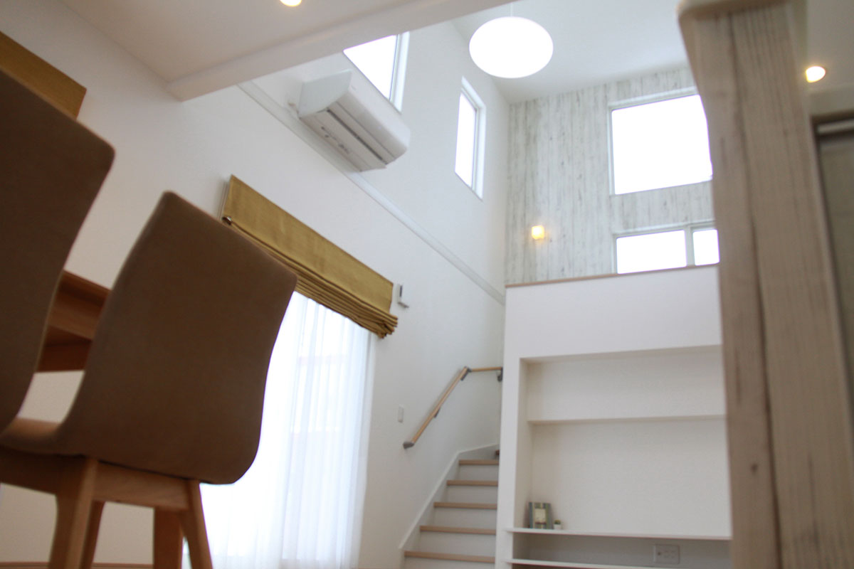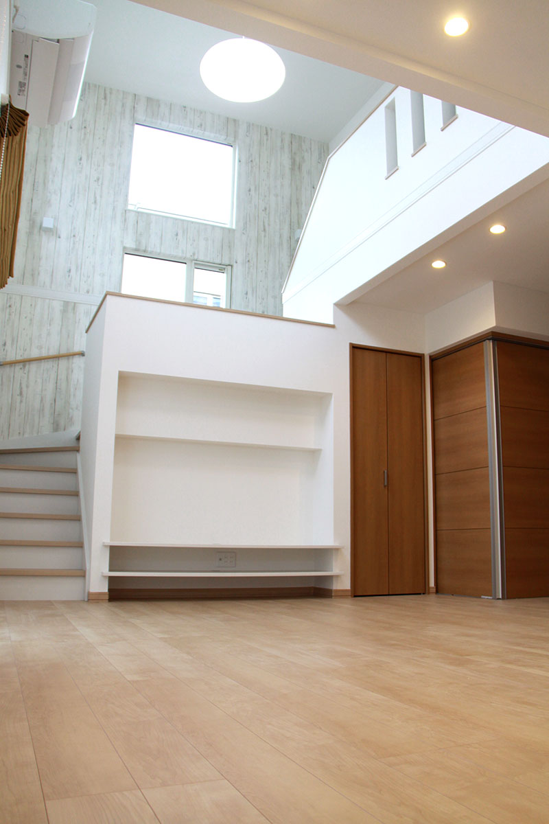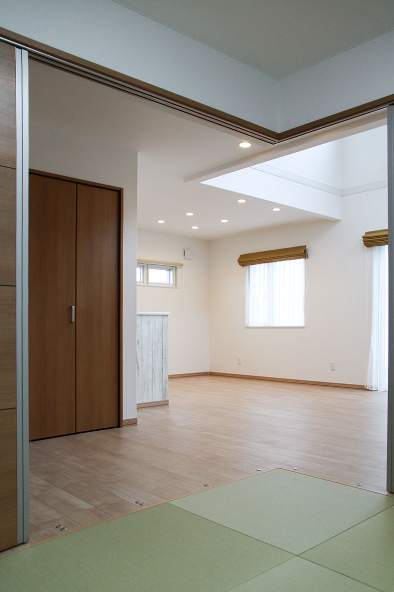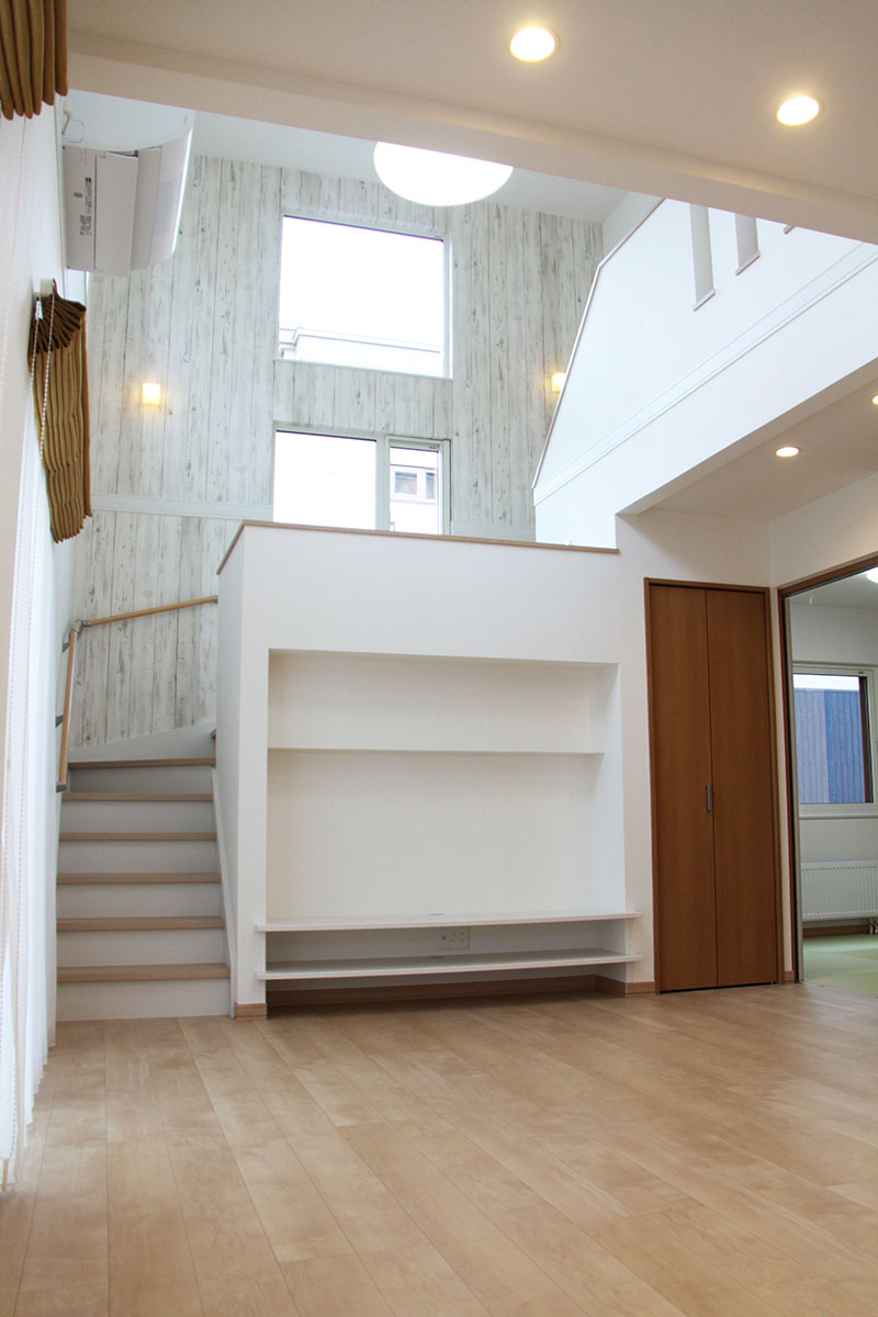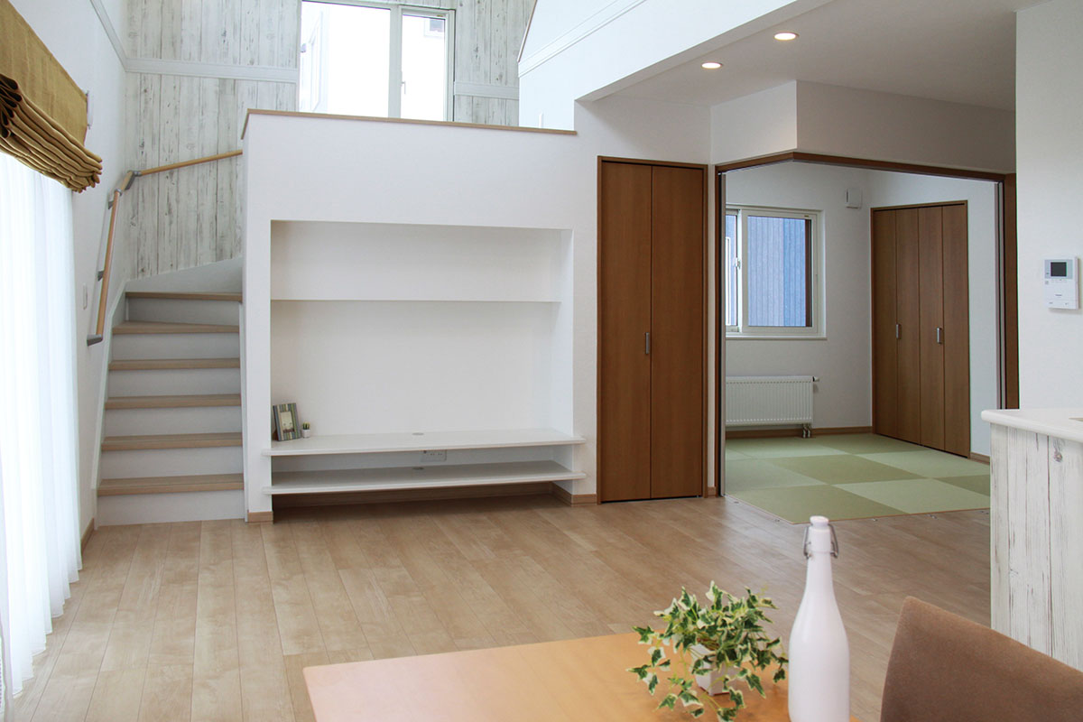 北斗市にある人気の分譲地、グリーンヴィラ北斗シティ内にある建売住宅です。4.5帖の大きめの吹き抜けが印象的な中二階。リビング横には4.5帖の和室もあり、リビングに広がりを持たせてくれます。ここではゆったりしたいですよね!
