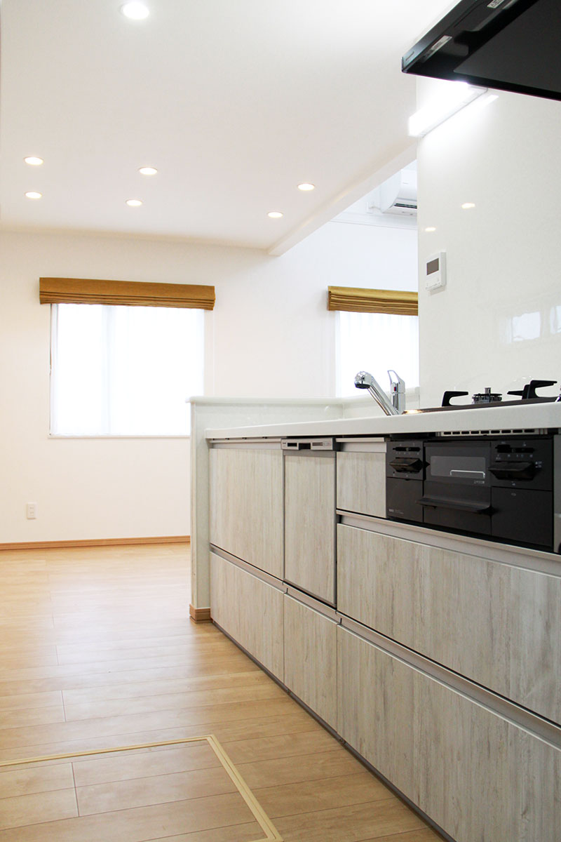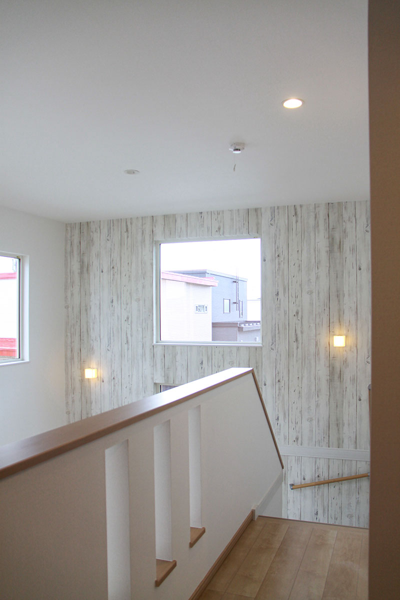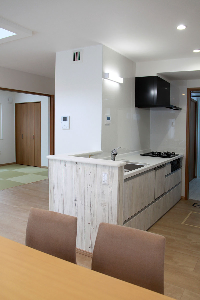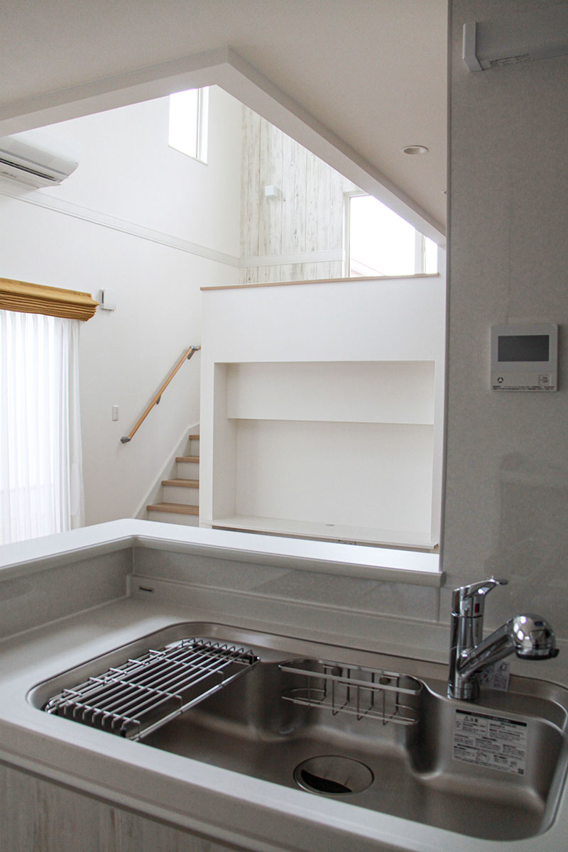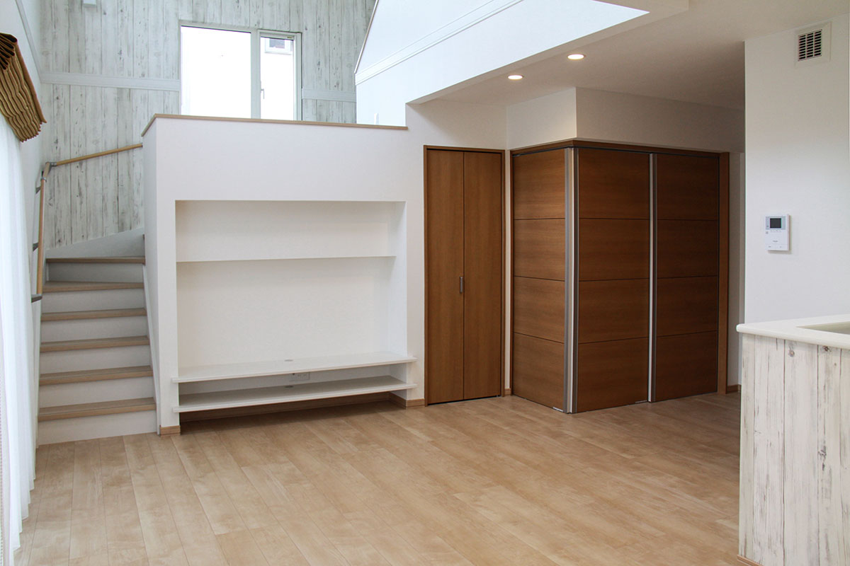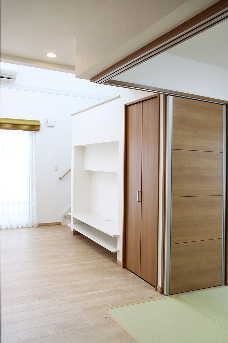 北斗市にある人気の分譲地、グリーンヴィラ北斗シティ内にある建売住宅です。4.5帖の大きめの吹き抜けが印象的な中二階。リビング横には4.5帖の和室もあり、リビングに広がりを持たせてくれます。ここではゆったりしたいですよね!