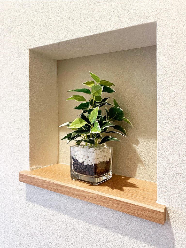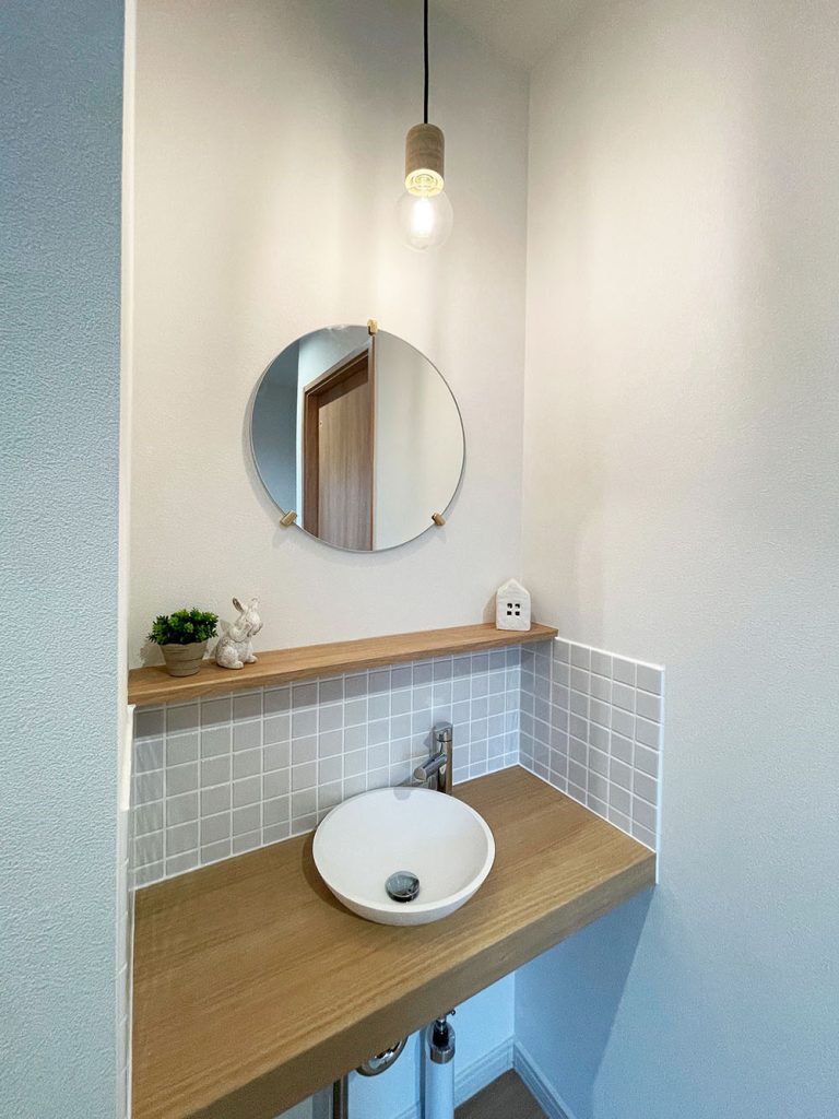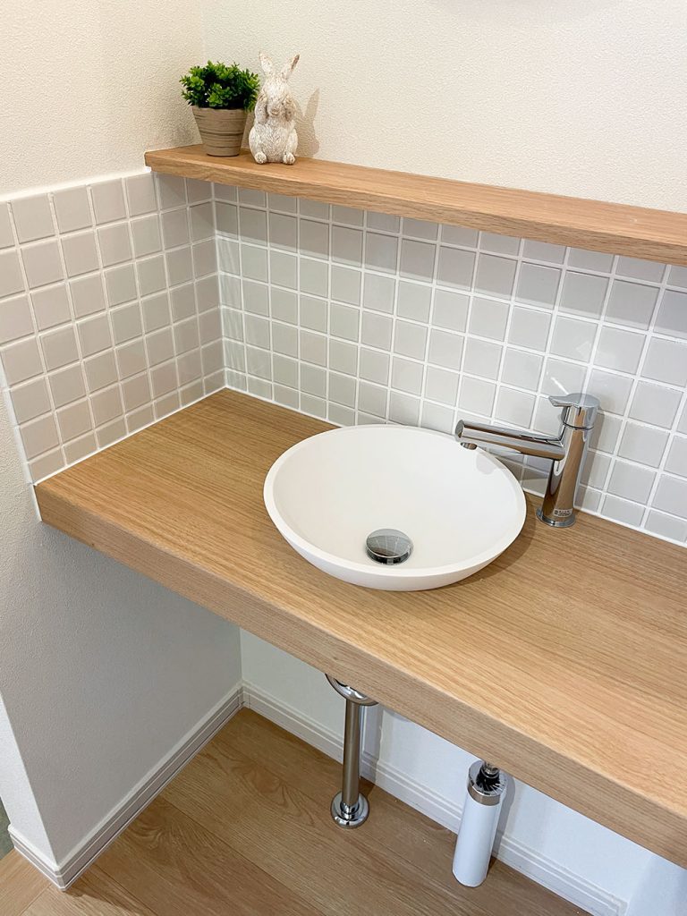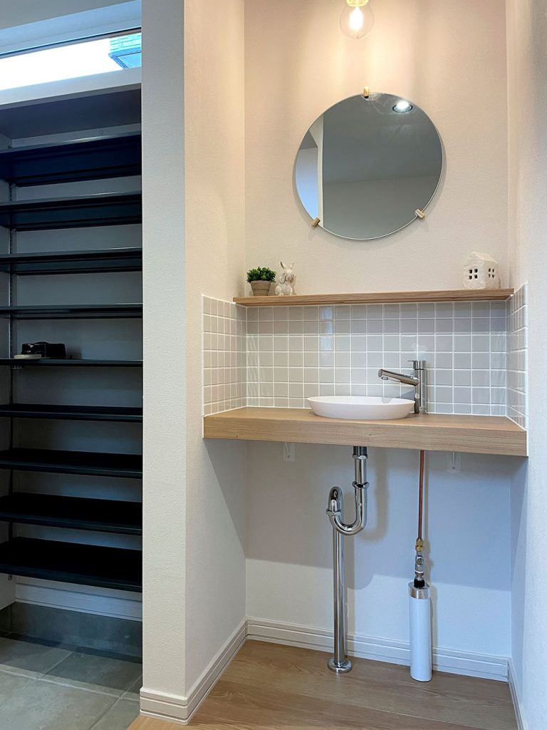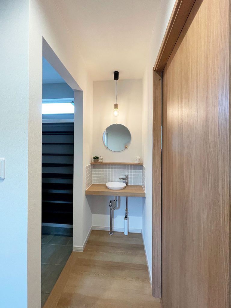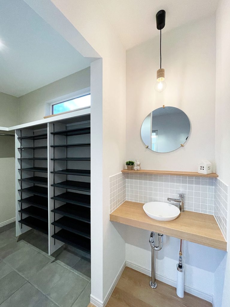 玄関には、便利なシューズクローク、その横には手洗いスペースを設けています。かわいらしいデザインですよね!ここでも、なんだかほっこりします。