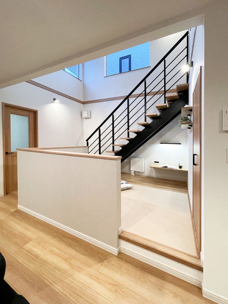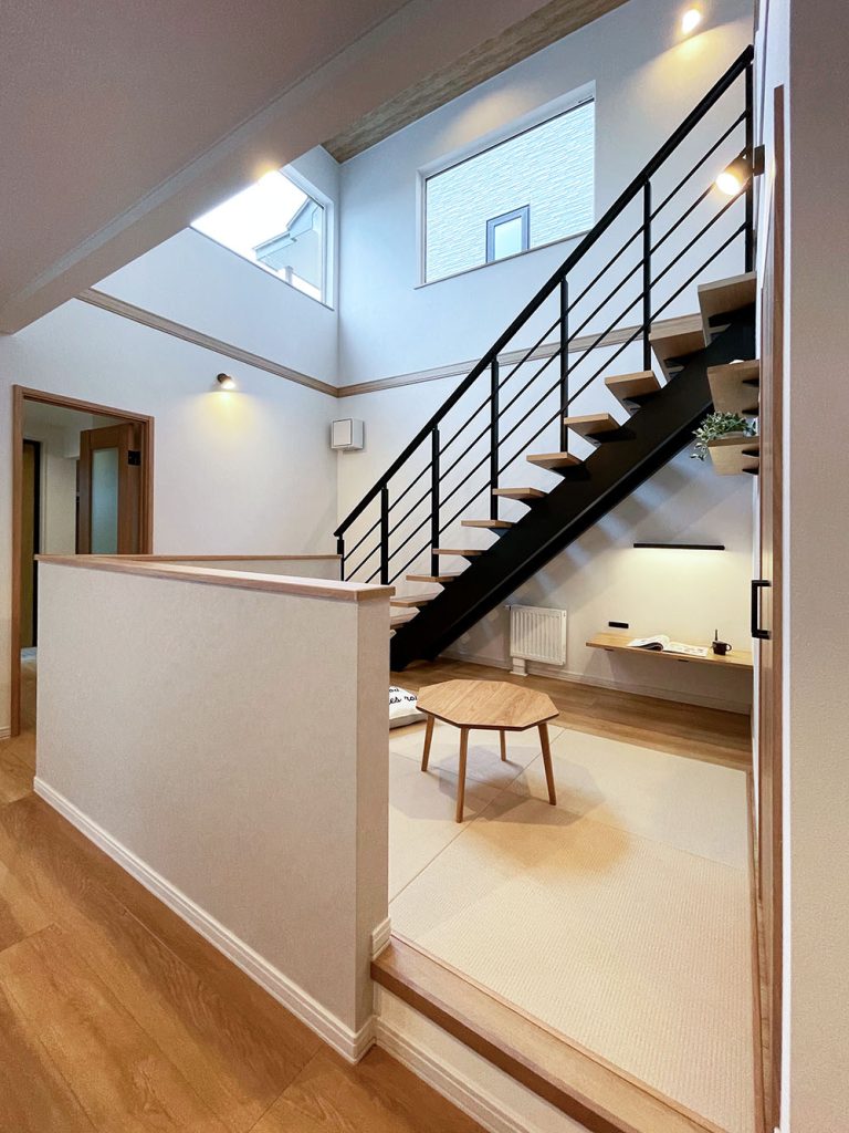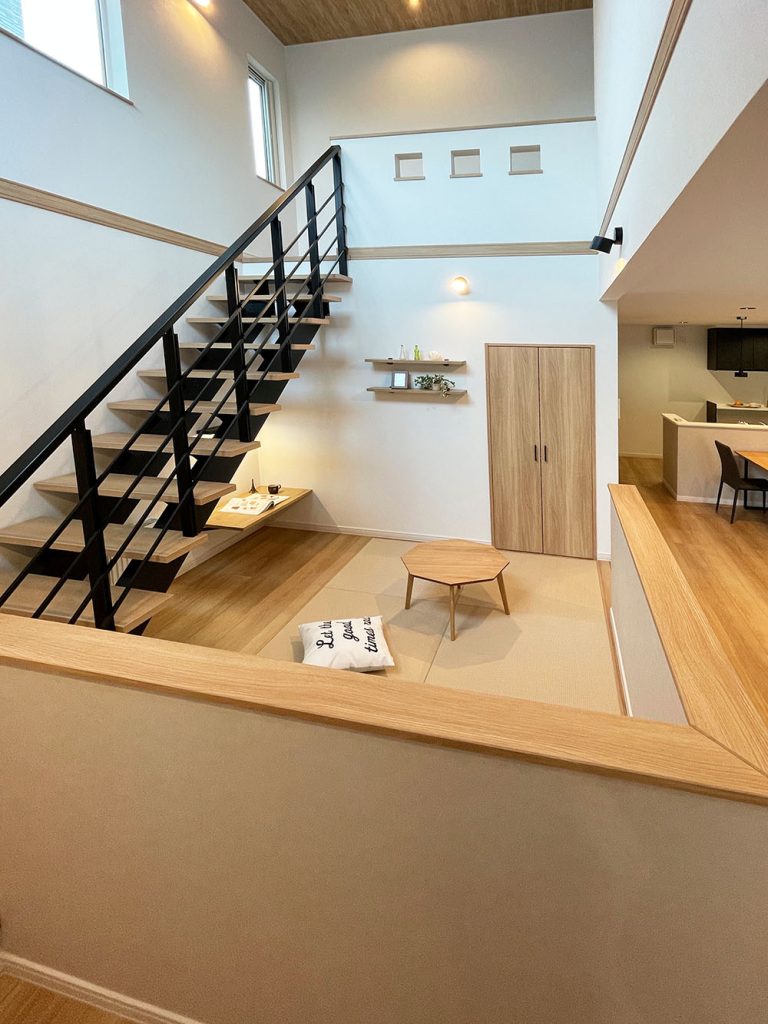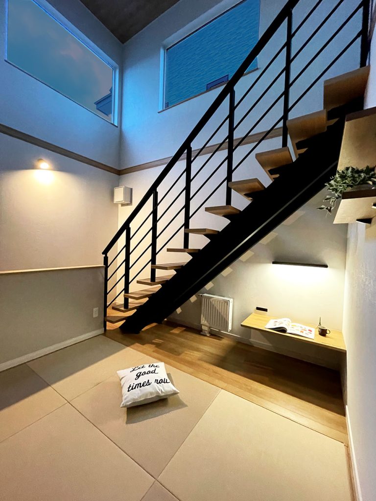 夜の雰囲気です。こちらがほっこりタタミスペースです。このスペースは、腰壁で囲まれているので、3帖のタタミスペースではありますが、狭さをあまり感じません。というのも階段がさらし階段で、その下もこのタタミスペースに含まれるため窮屈さを感じないんですね!