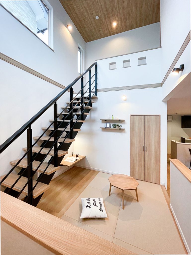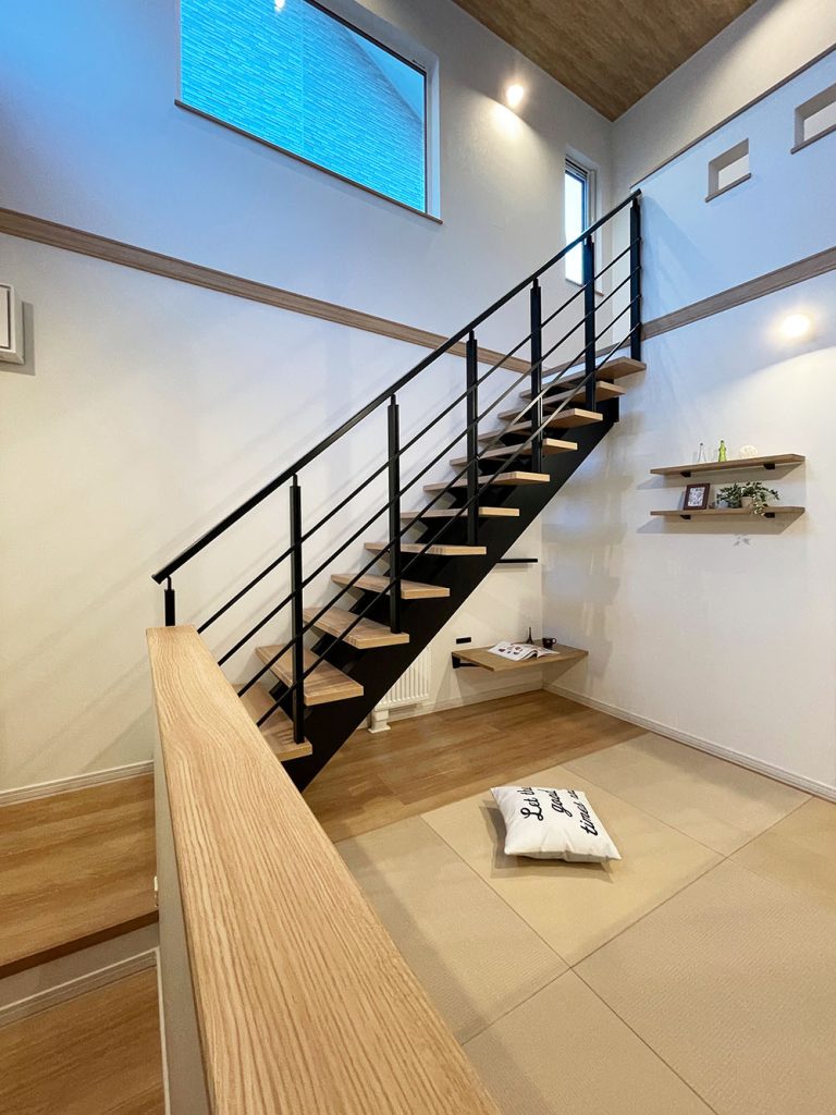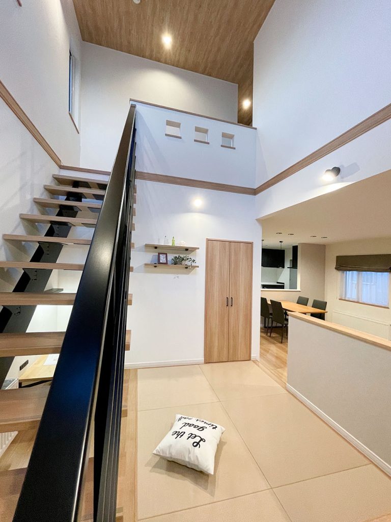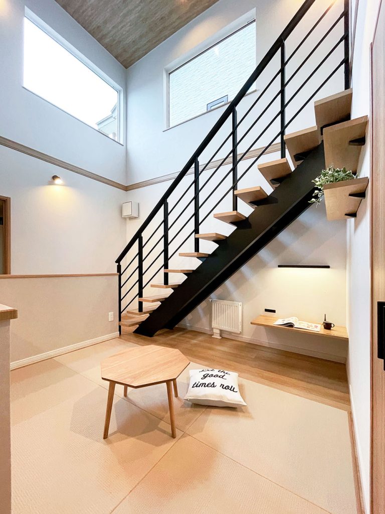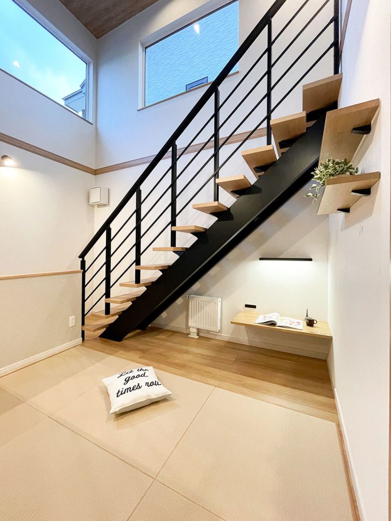夜の雰囲気です。こちらがほっこりタタミスペースです。このスペースは、腰壁で囲まれているので、3帖のタタミスペースではありますが、狭さをあまり感じません。というのも階段がさらし階段で、その下もこのタタミスペースに含まれるため窮屈さを感じないんですね!