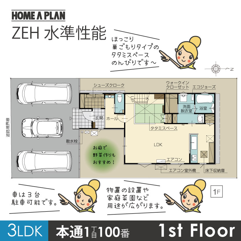 車は3台駐車可能です。敷地面積は、55.77坪。駐車スペースの後ろ側では、物置の設置も可能ですが、その他ちょっとした家庭菜園、花壇なども楽しめそうです。