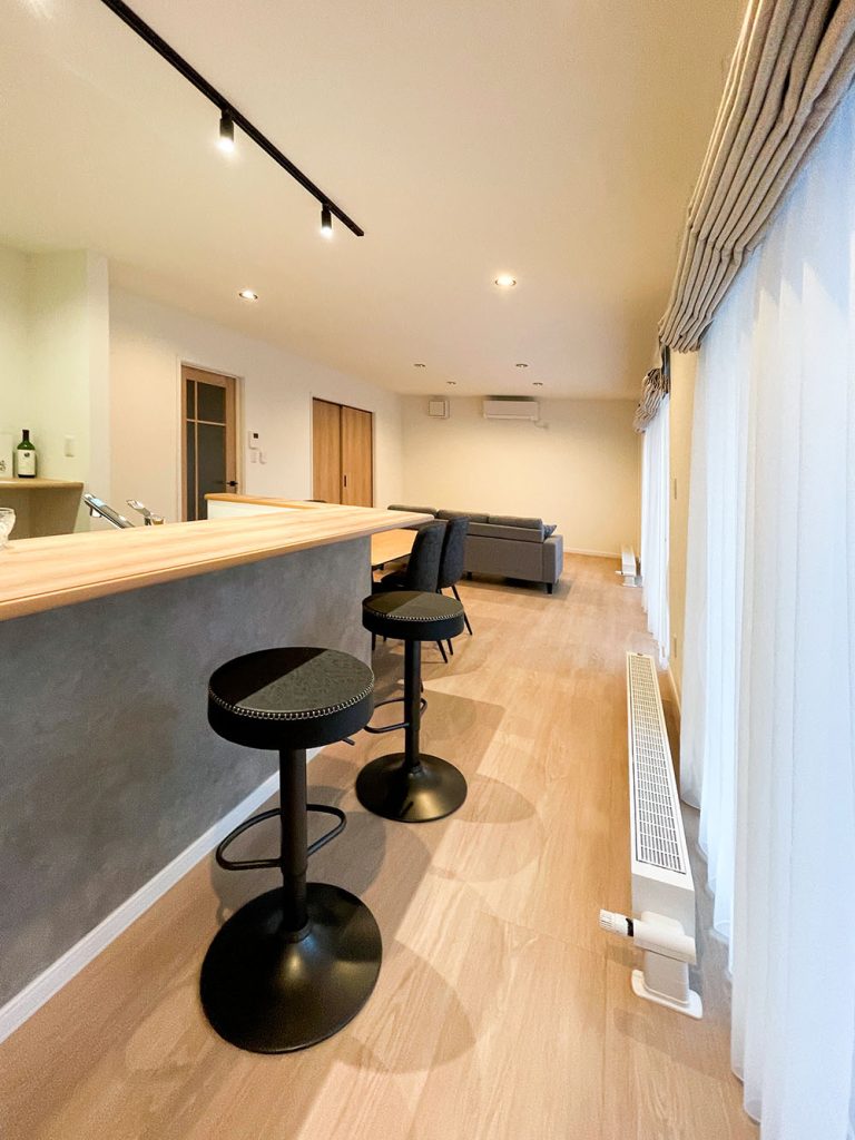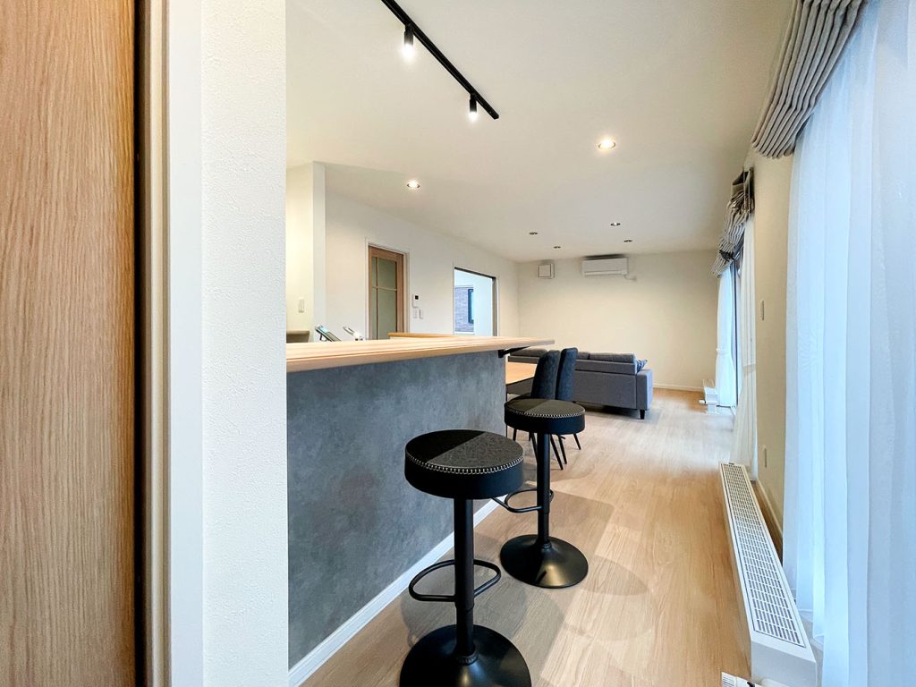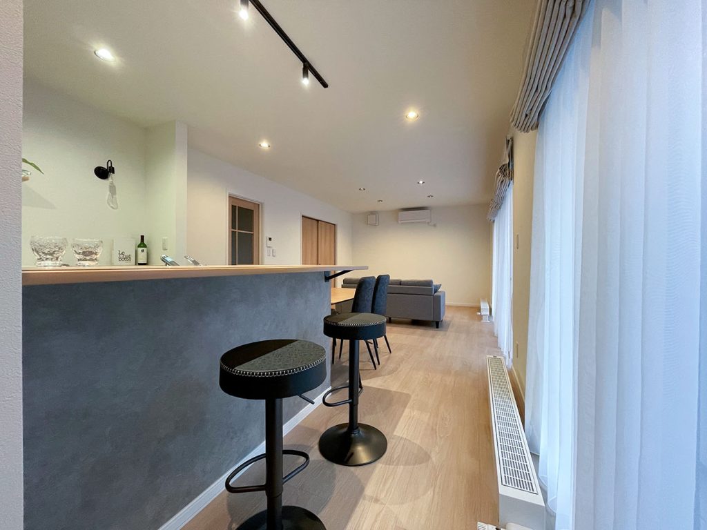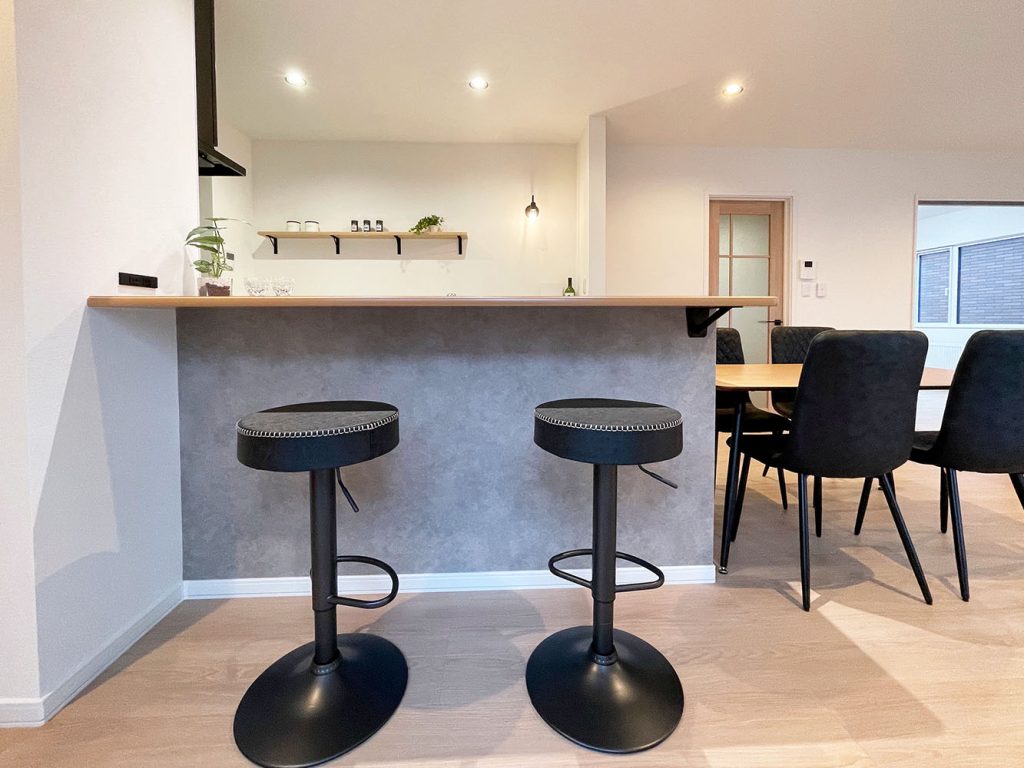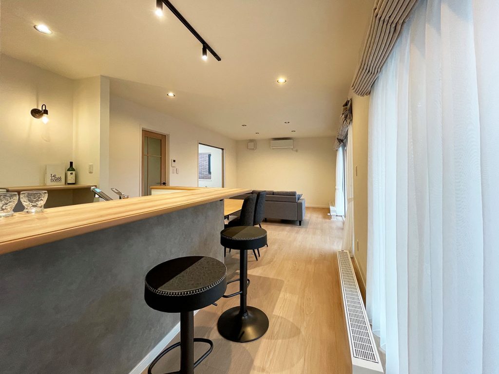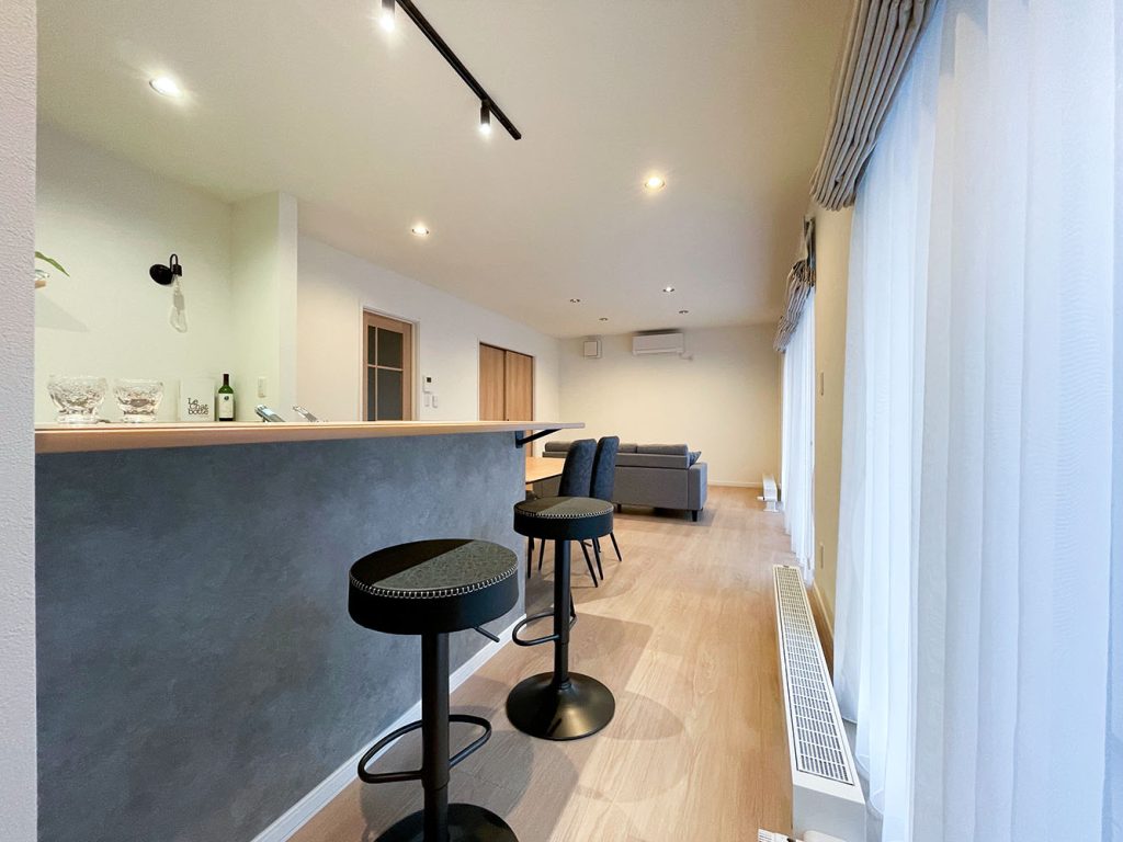 キッチンは対面式になっていて、カウンターも広め。このスペースに椅子を置くとバーの雰囲気です。