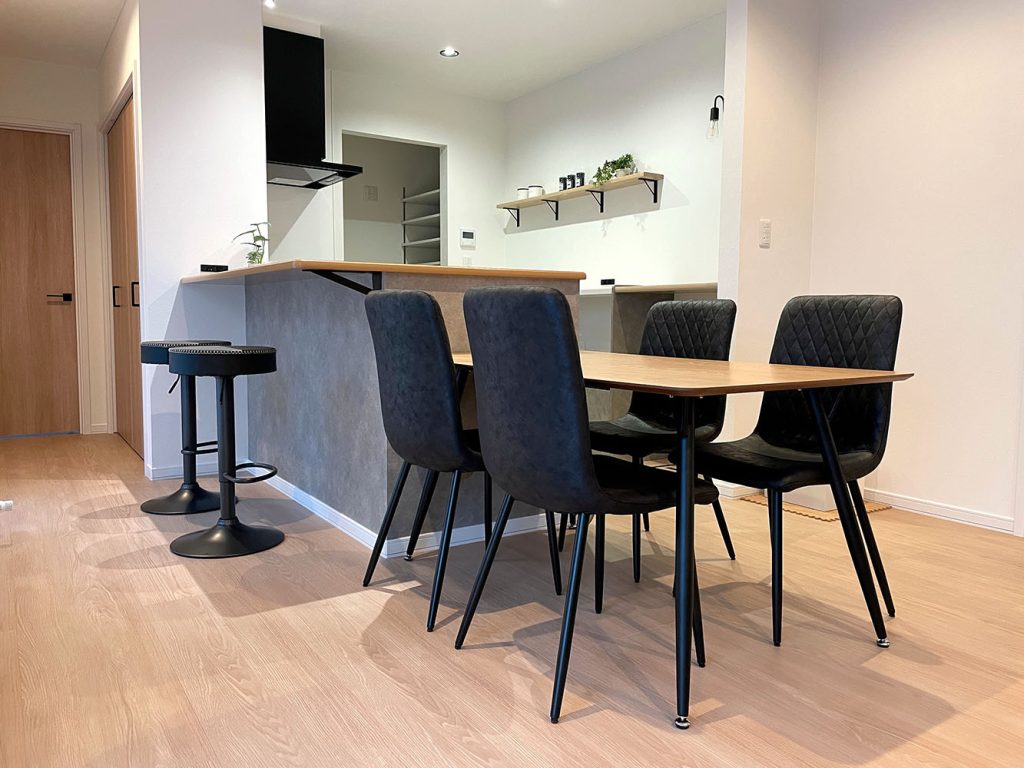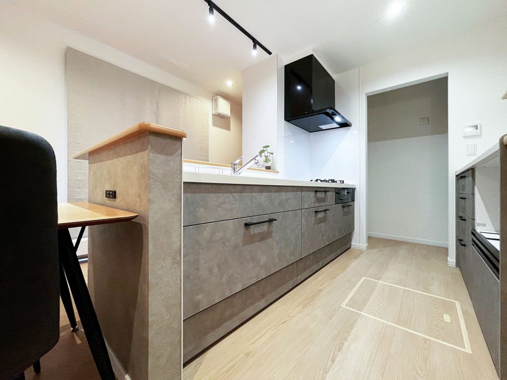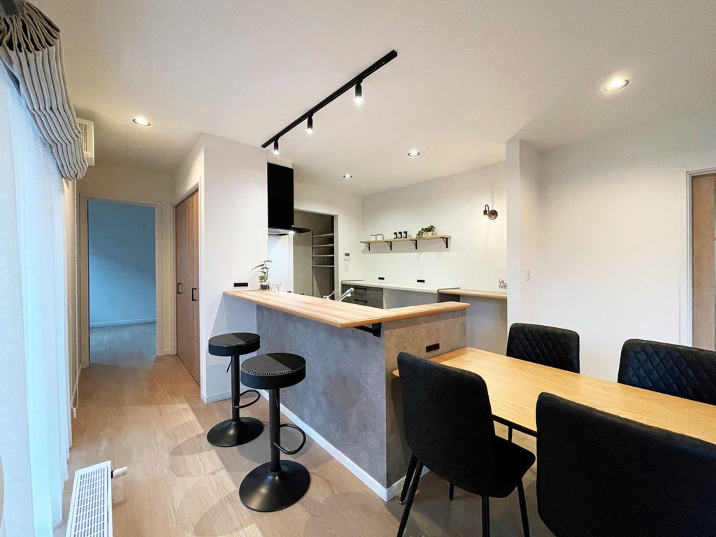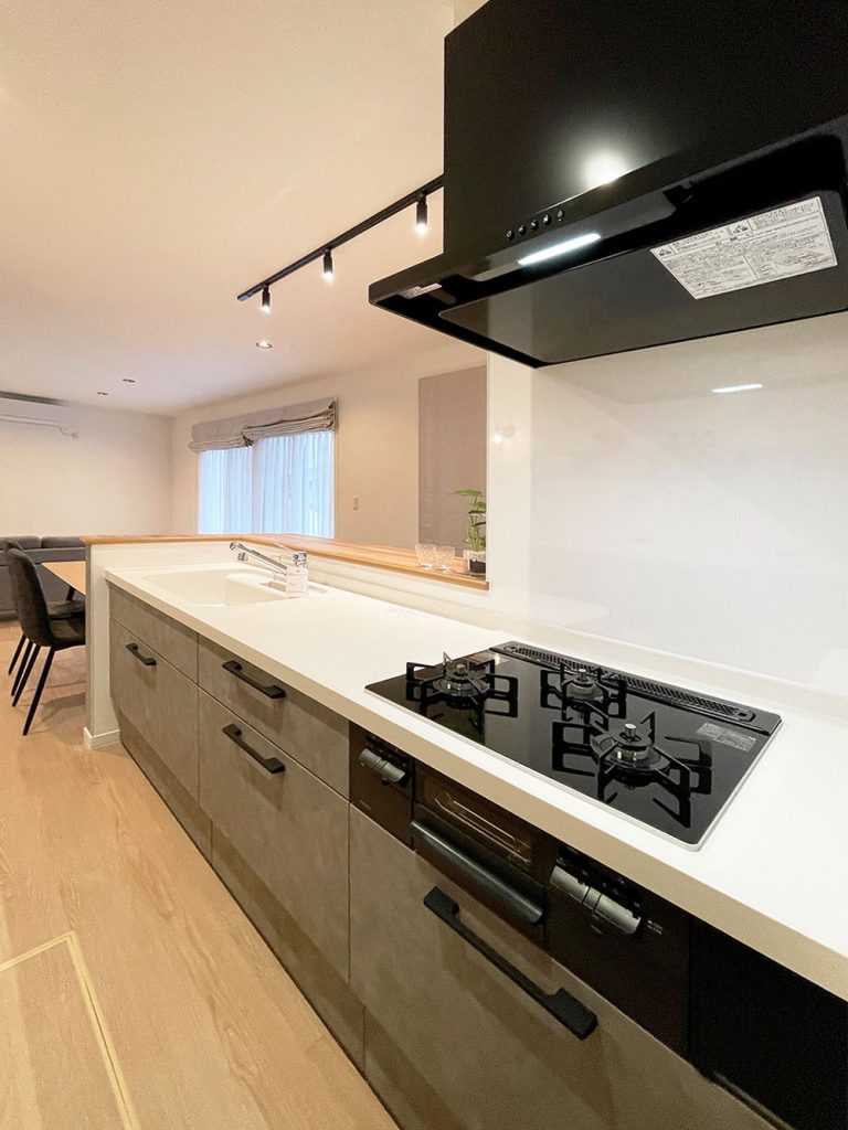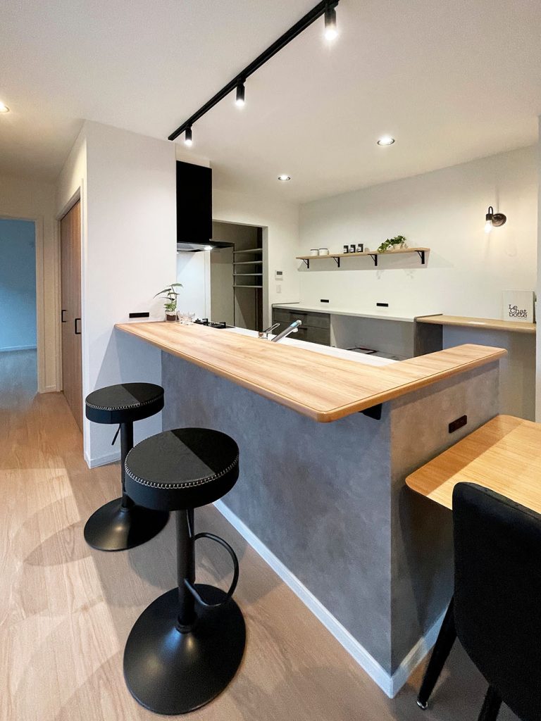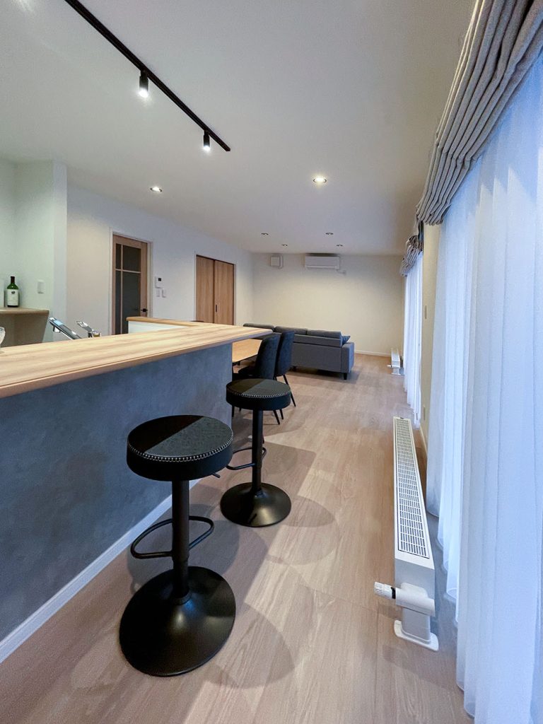 キッチンは対面式になっていて、カウンターも広め。このスペースに椅子を置くとバーの雰囲気です。