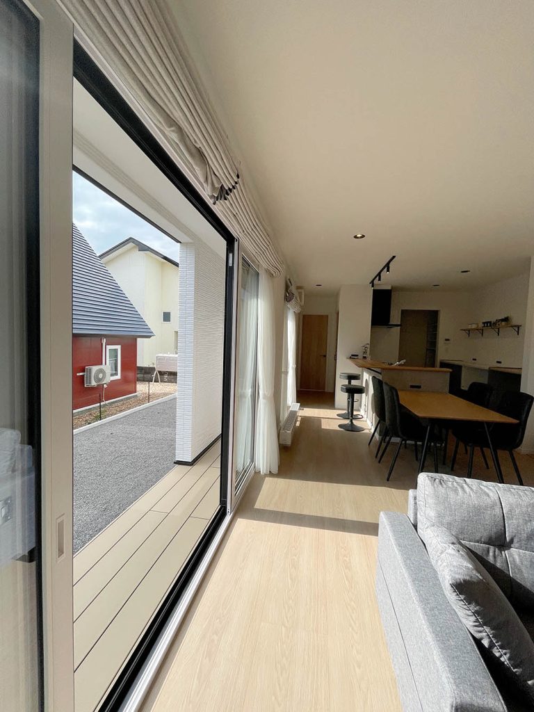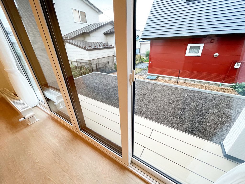 大きな掃き出し窓から庭へと。バーベキューの時などは便利ですね!ドッグランとして使ったときもワンちゃんの様子がすぐに目に入るのもうれしいです。