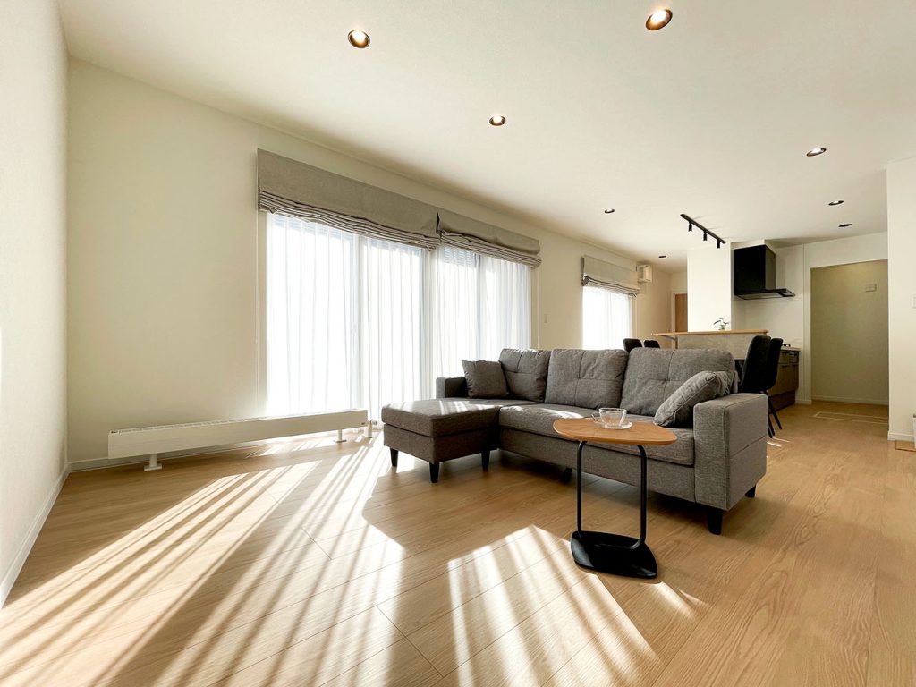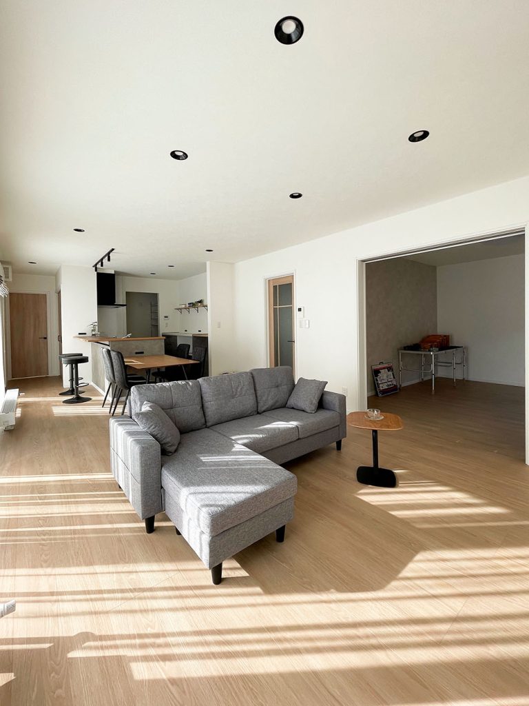 大きな掃き出し窓が印象的な明るいリビング。お部屋の中が明るいのは本当にうれしいですよね!