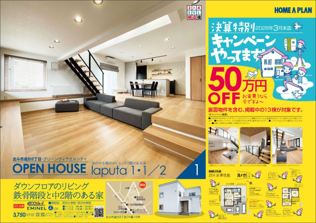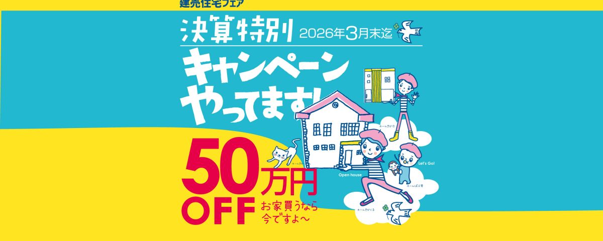 ホーム企画では、ただいま決算特別キャンペーンを実施しております!2026年3月末までに対象の物件にてご成約のお客さまを対象に1棟につき、50万円OFFでご提供いたします。