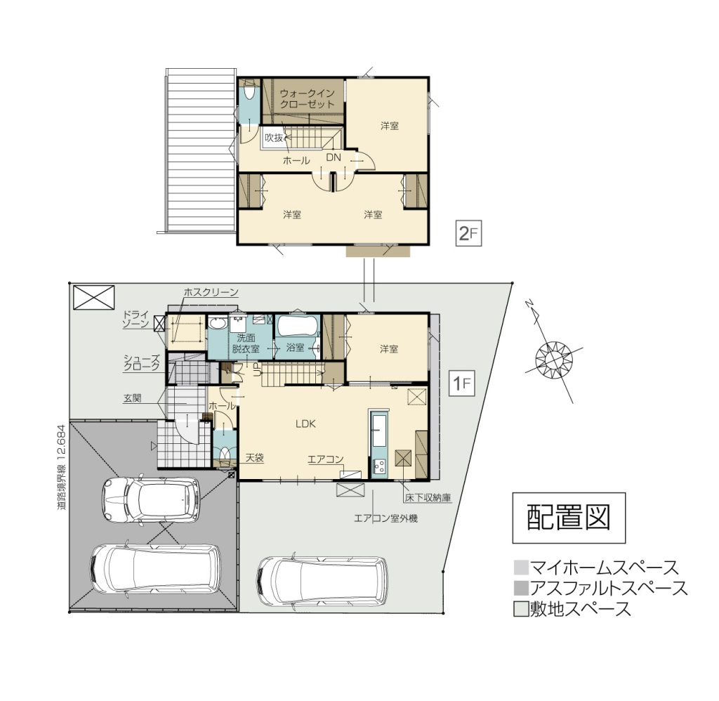 敷地は59.84坪と少し広めです。車は3台駐車可能。