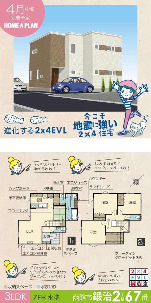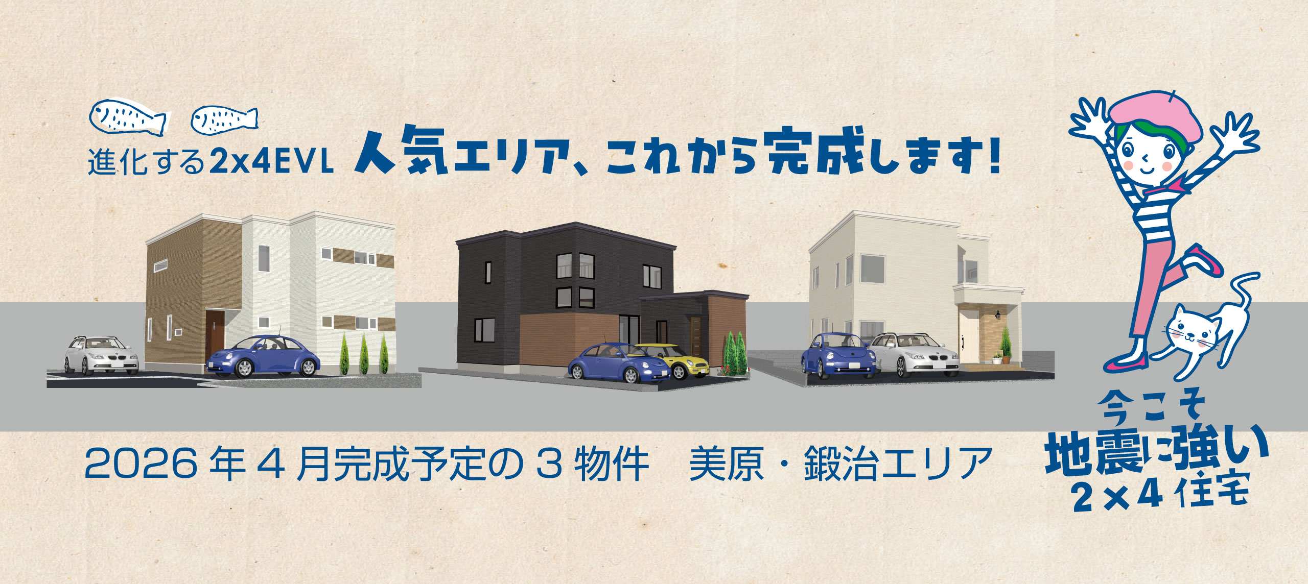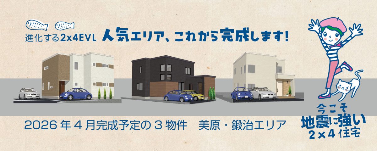2026年4月は、3棟の建売住宅の完成を予定しております。どちらの物件も人気のエリアなんです。美原エリアでは2丁目と4丁目。鍛治エリアでは2丁目です。