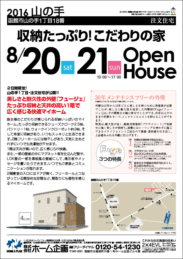 2016年8月20日(土)・21日(日)は、函館市山の手1丁目にて注文住宅の完成現場見学会を開催します!