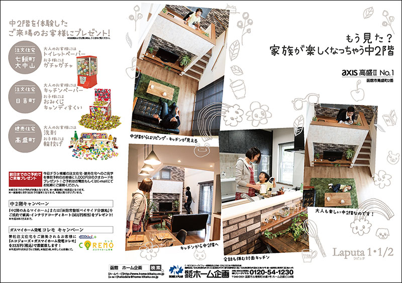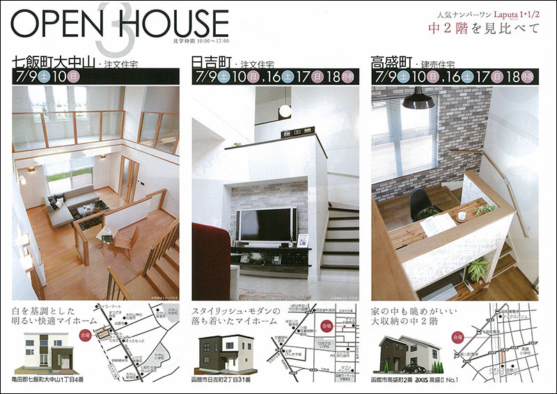 7月9日(土)・10日(日)は、高盛町・日吉町・七飯大中山にてホーム企画人気の中2階、ラピュタ1・1/2の同時3棟公開です!