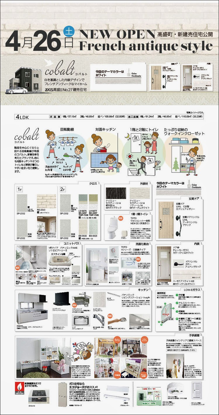ゴールデンウィークオープン予定のアクシス高盛の新しい建売住宅は、白を基調としたフレンチアンティークがお好きな方におすすめの新建売住宅です。こちらの建物の特徴 は、階段を中心にぐるりと回れる回転動線が特長で、家事効率を考えたプランです。他にも対面キッチンや2つのトイレなど家族が暮らしやすい住まい をご提案します。