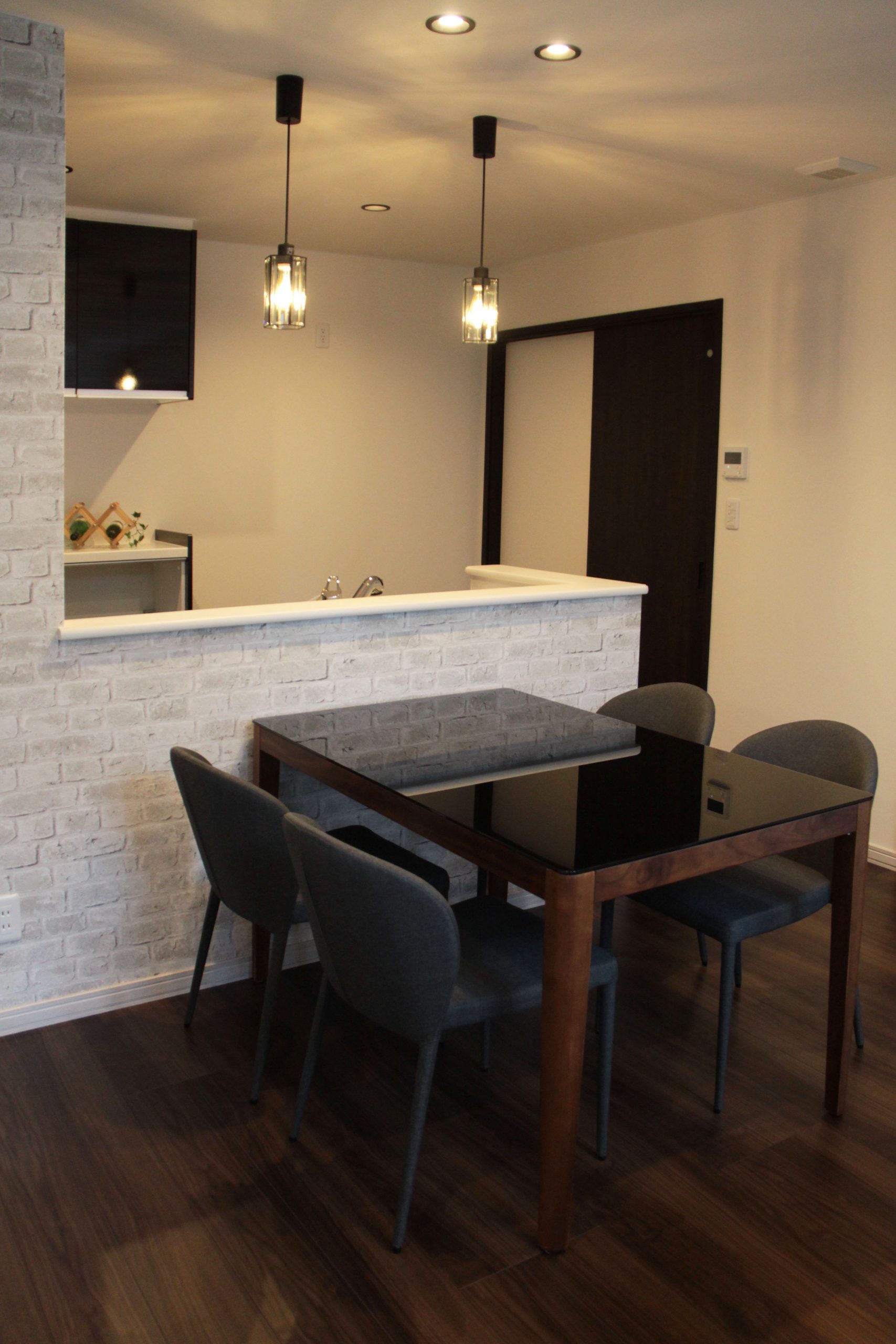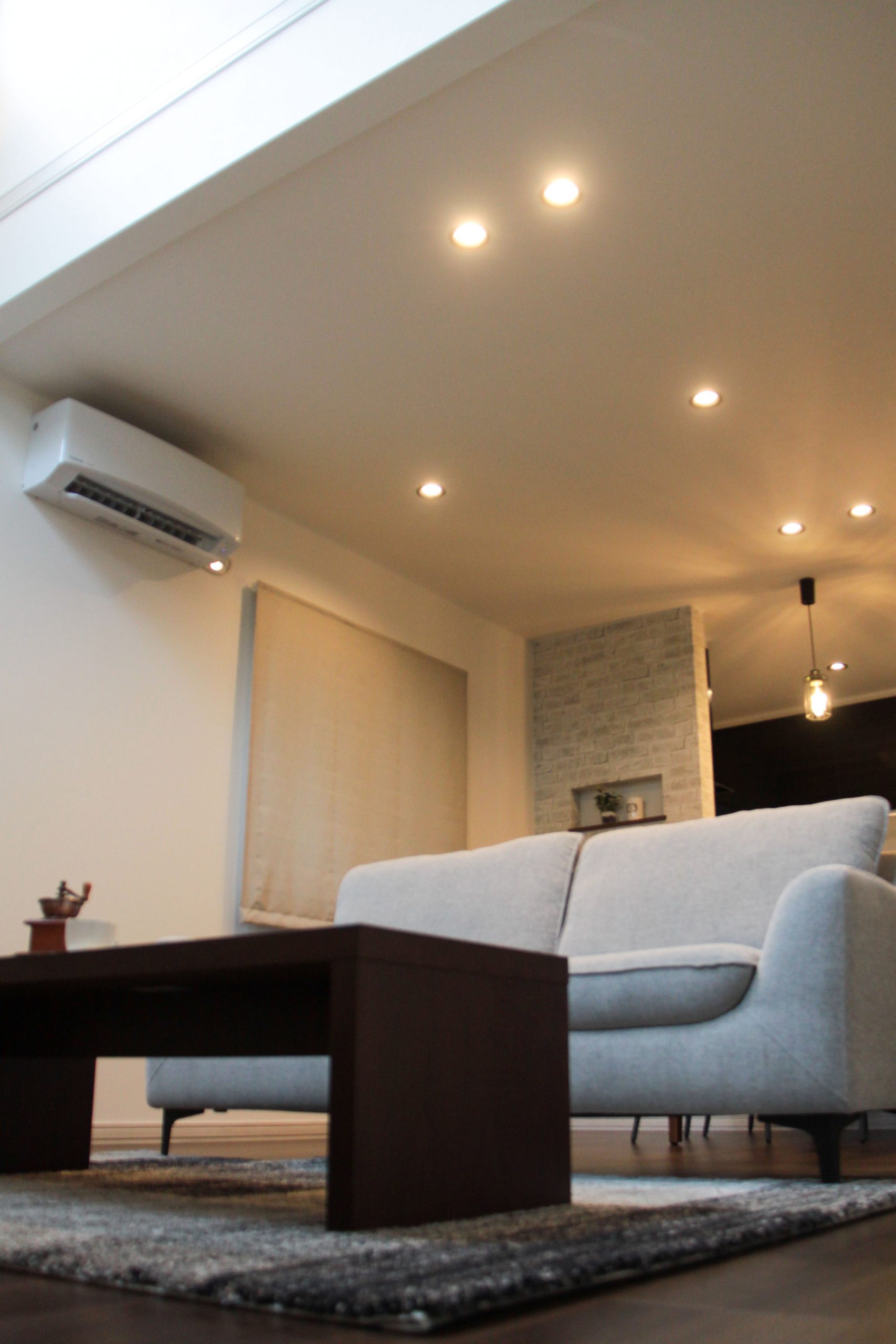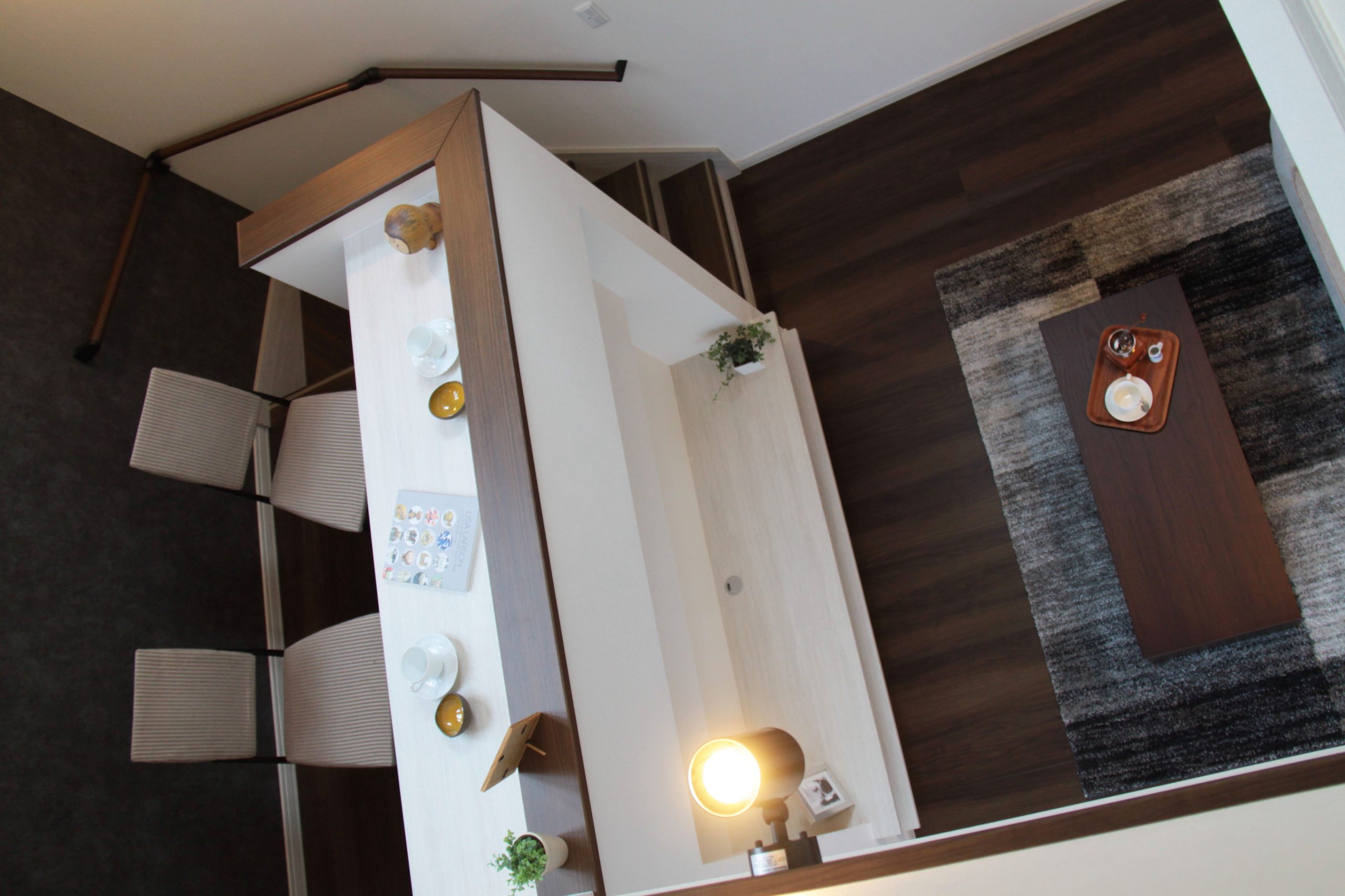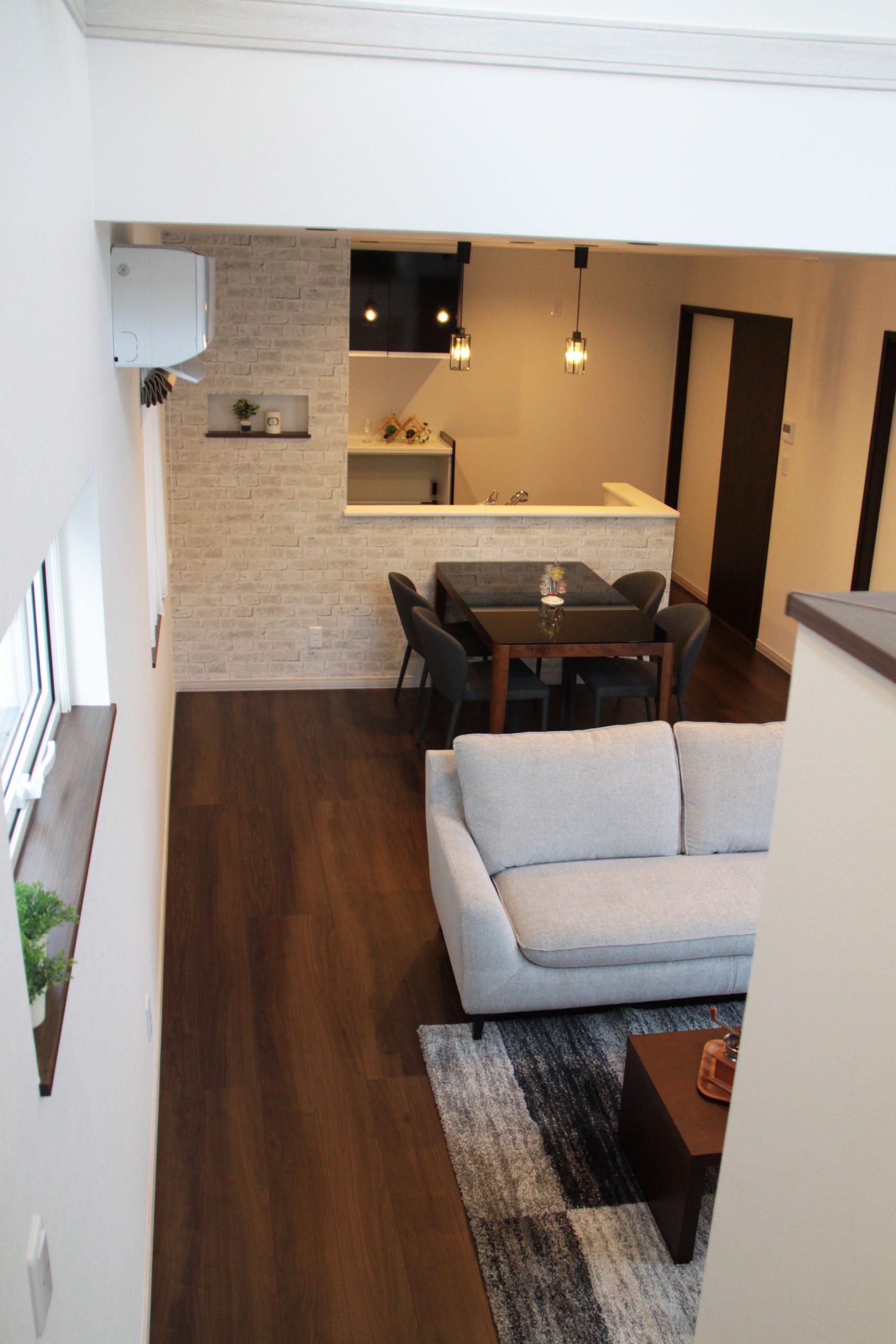 落ち着いたシックなカラーリング。吹き抜けが素敵です~ 中2階スペースは2階ホールから撮影。こちらの建物も現在使っているリビングとダイニングスペースの家具がそのままつきます。