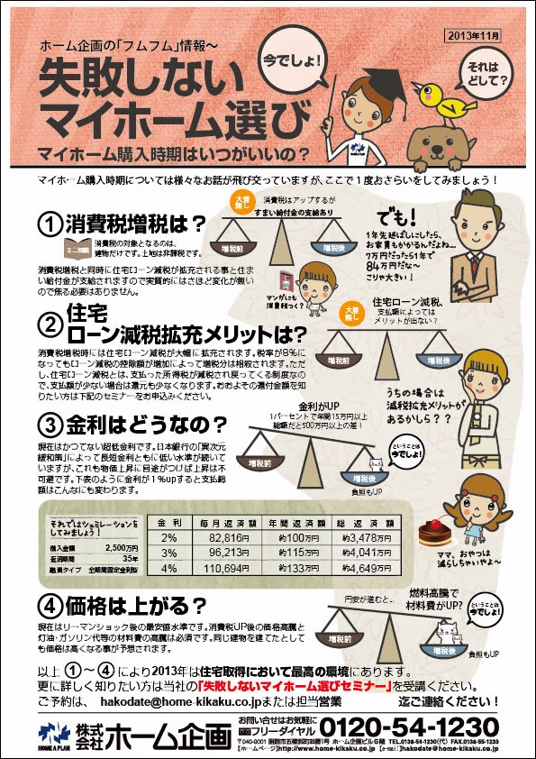 マイホーム建築は消費税アップ前と消費税アップ前、どちらがいいの~?とお考えであればぜひホーム企画の「失敗しないマイホーム選びセミナー」を受講してみてください!!