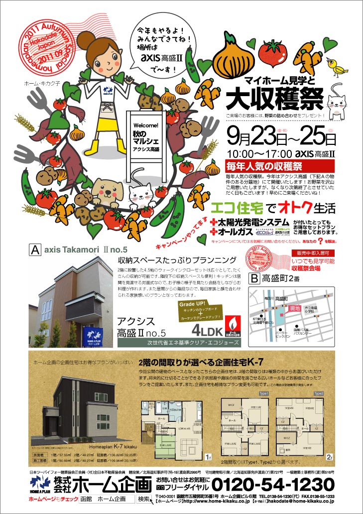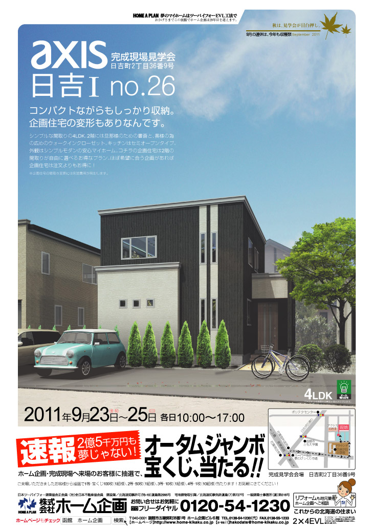 ホーム企画の2011年9月のイベントは、アクシス高盛での収穫祭りと、ホーム企画の建売住宅・モデルハウスにご来場いただいたお客様に、抽選で2011年のオータムジャンボ宝くじ当たっちゃいます! 今回オープン物件はこちら。CLICK 是非いらしてくださいね!